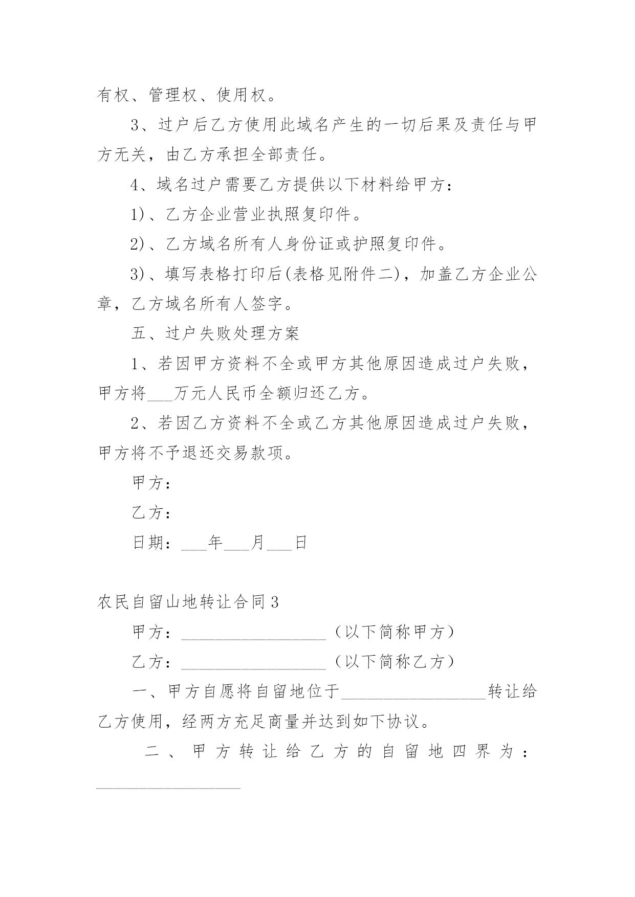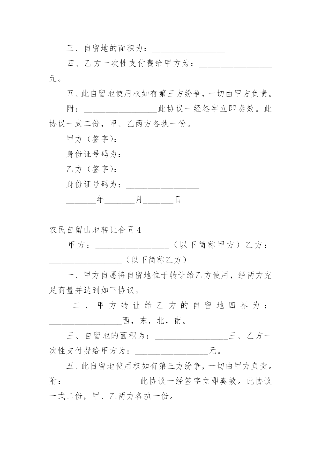 农民自留山地转让合同农民自留山地转让合同在人民愈发重视法律的社会中,能够利用到合同的场合越来越多,它可以保护民事法律关系。那么我们拟定合同的时候需要注意什么问题呢?以下是小编精心整理的农民自留山地转让合同,希望能够帮助到大家。农民自留山地转让合同1卖方:__________________(以下简称甲方)身份证号:__________________住址:__________________电话:__________________买方:__________________(以下简称乙方)身分证号:___