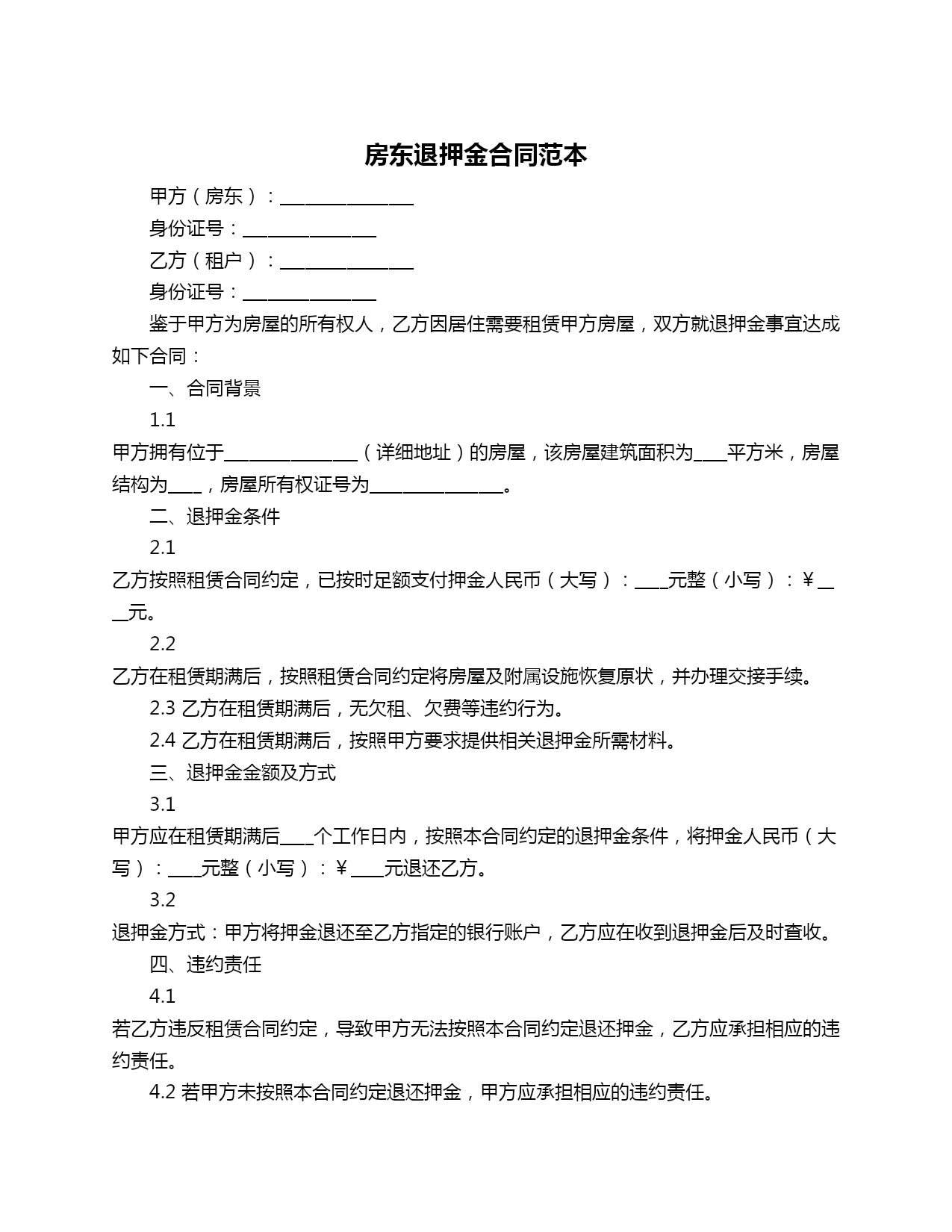 房东退押金合同范本甲方(房东):________________身份证号:________________乙方(租户):________________身份证号:________________鉴于甲方为房屋的所有权人,乙方因居住需要租赁甲方房屋,双方就退押金事宜达成如下合同:一、合同背景1.1甲方拥有位于________________(详细地址)的房屋,该房屋建筑面积为____平方米,房屋结构为____,房屋所有权证号为________________。二、退押金条件2.1乙方按照租赁合同约定,已按时