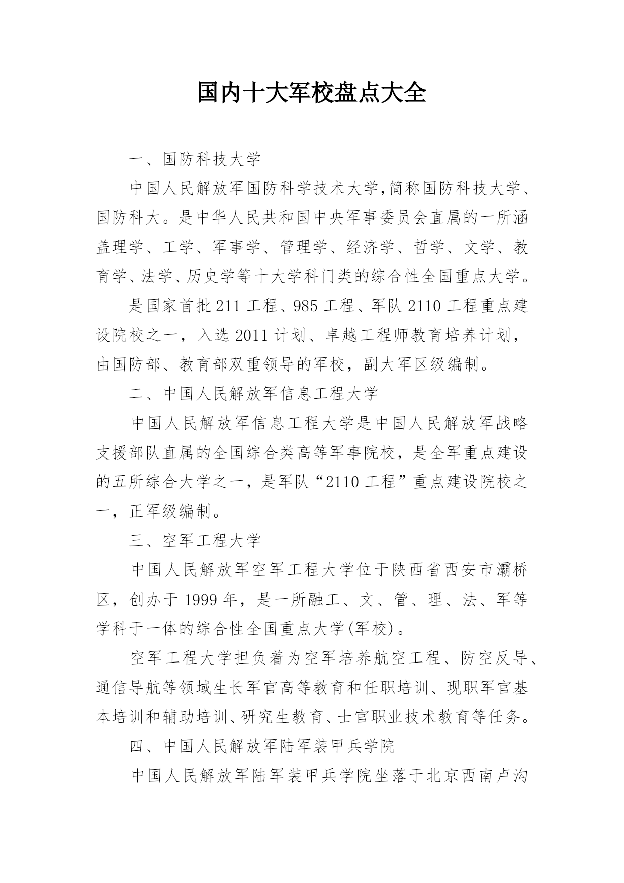 国内十大军校盘点大全一、国防科技大学中国人民解放军国防科学技术大学,简称国防科技大学、国防科大。是中华人民共和国中央军事委员会直属的一所涵盖理学、工学、军事学、管理学、经济学、哲学、文学、教育学、法学、历史学等十大学科门类的综合性全国重点大学。是国家首批211工程、985工程、军队2110工程重点建设院校之一,入选2011计划、卓越工程师教育培养计划,由国防部、教育部双重领导的军校,副大军区级编制。二、中国人民解放军信息工程大学中国人民解放军信息工程大学是中国人民解放军战略支援部队直属的全国综合类高等军事