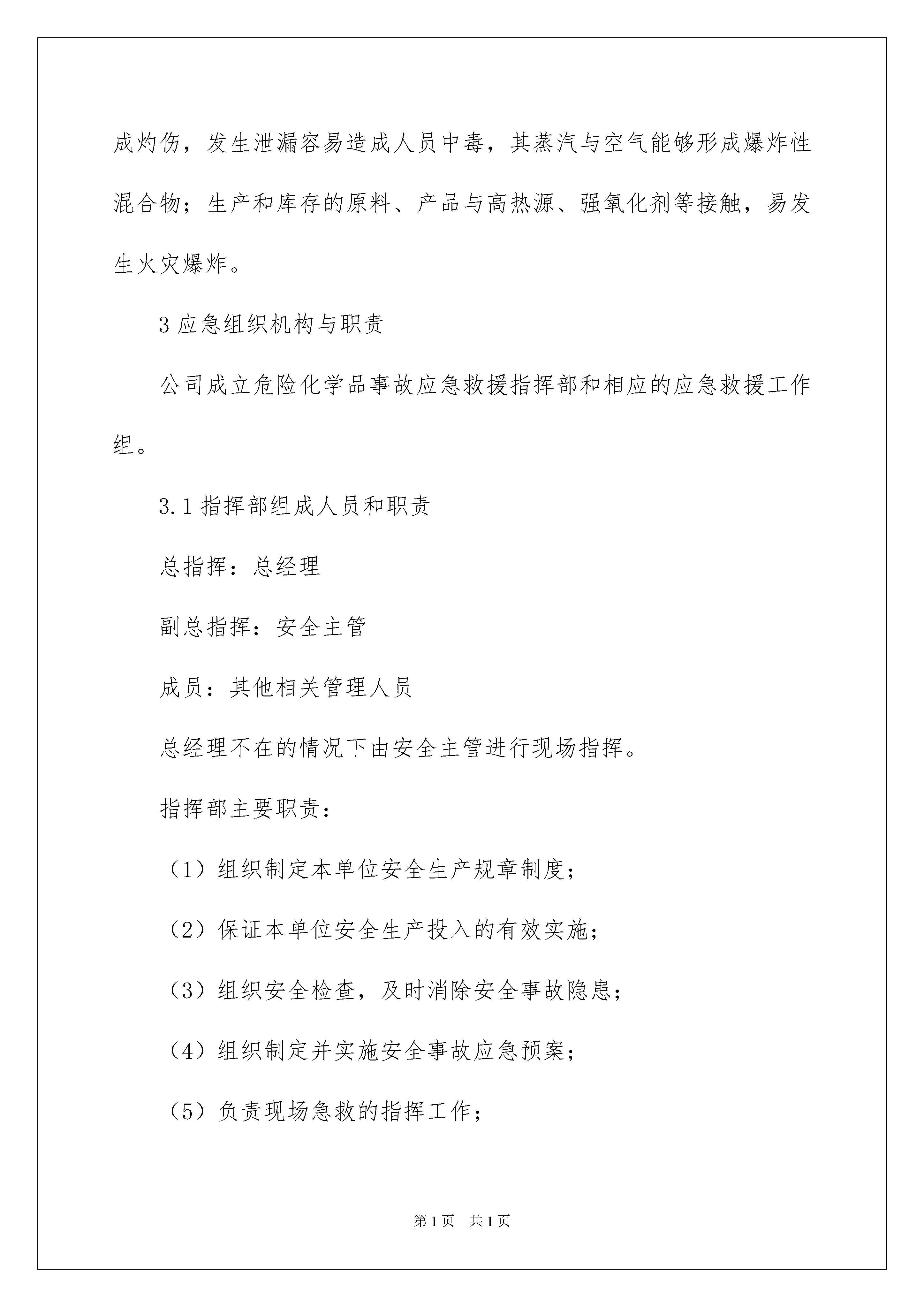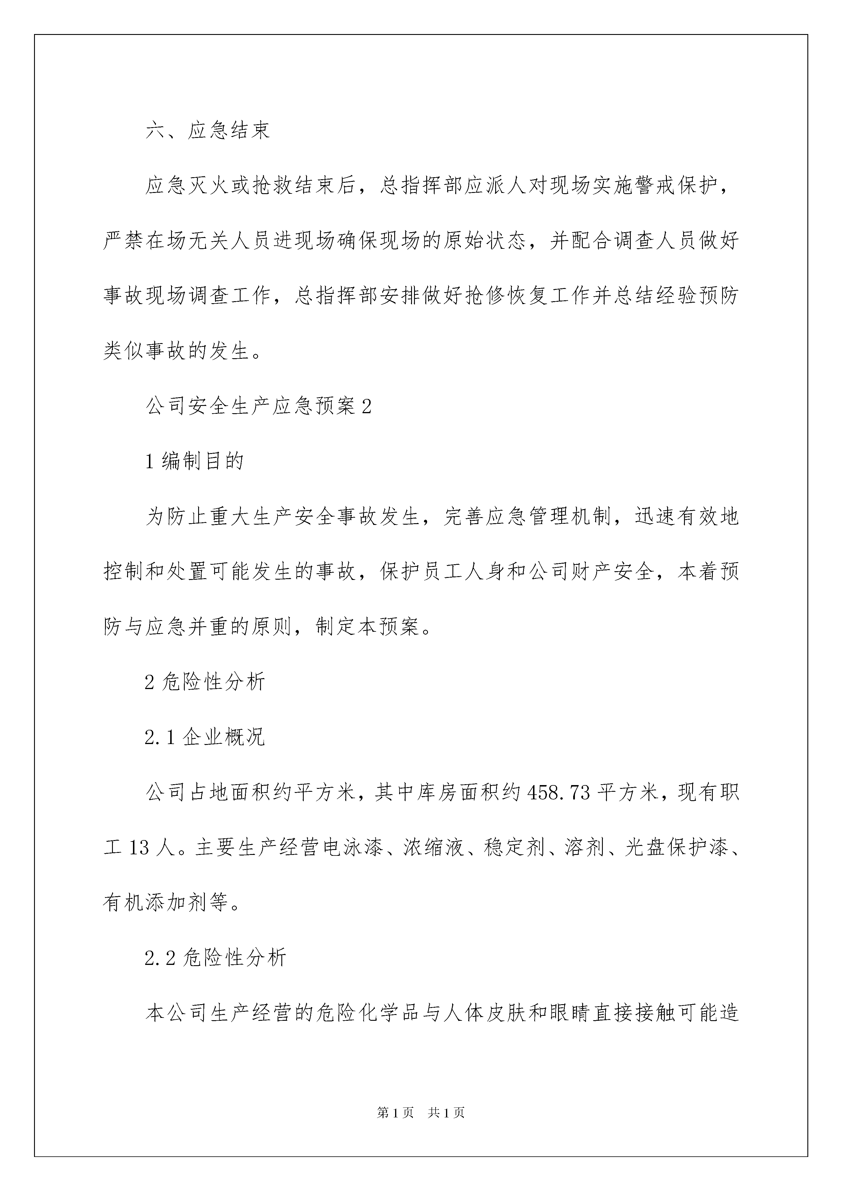 公司安全生产应急预案公司安全生产应急预案1一、、编制目的:根据我公司化学品可能发生燃烧和化学品皮肤烧伤的特点防止重大安全事故发生完善应急管理机制迅速有效地控制和处置可能发生的事故保护职工人身和公司财产安全本着预防和应急并重的原则制定本预案。二、、危险性分析:1、企业概况:我公司位于临朐县冶源镇宫家坡村东公司占地面积15000平方米其中库房面积520平方米车间540平方米职工50人生产工人20人主要生产造纸化学品。2、危险性分析:本公司所用的化