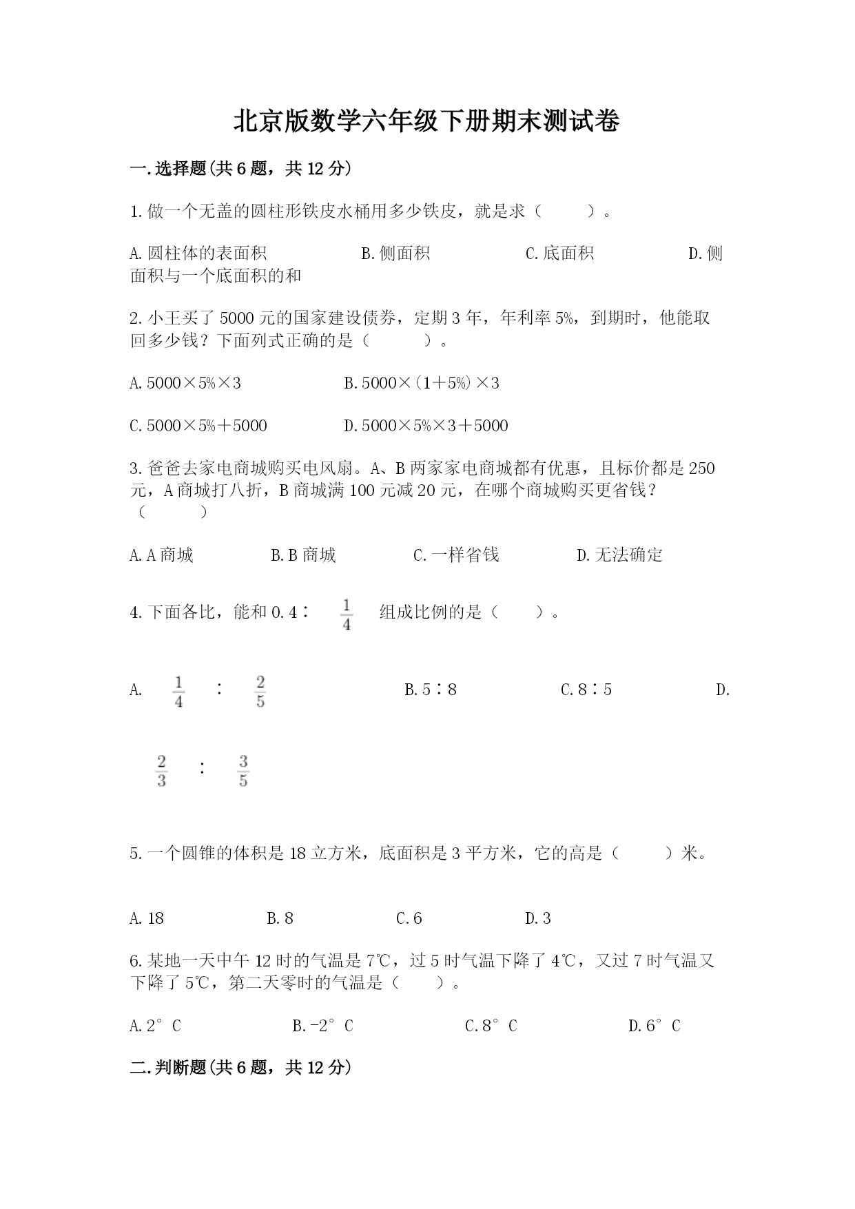 北京版数学六年级下册期末测试卷一.选择题(共6题,共12分)1.做一个无盖的圆柱形铁皮水桶用多少铁皮,就是求()。A.圆柱体的表面积B.侧面积C.底面积D.侧面积与一个底面积的和2.小王买了5000元的国家建设债券,定期3年,年利率5%,到期时,他能取回多少钱?下面列式正确的是()。A.5000×5%×3B.5000×(1+5%)×3C.5000×5%+5000D.5000×5%×3+50003.爸爸去家电商城购买电风扇。A、B两家家电商城都有优惠,且标价都是250元,A商城打八折,B商城满100元减20