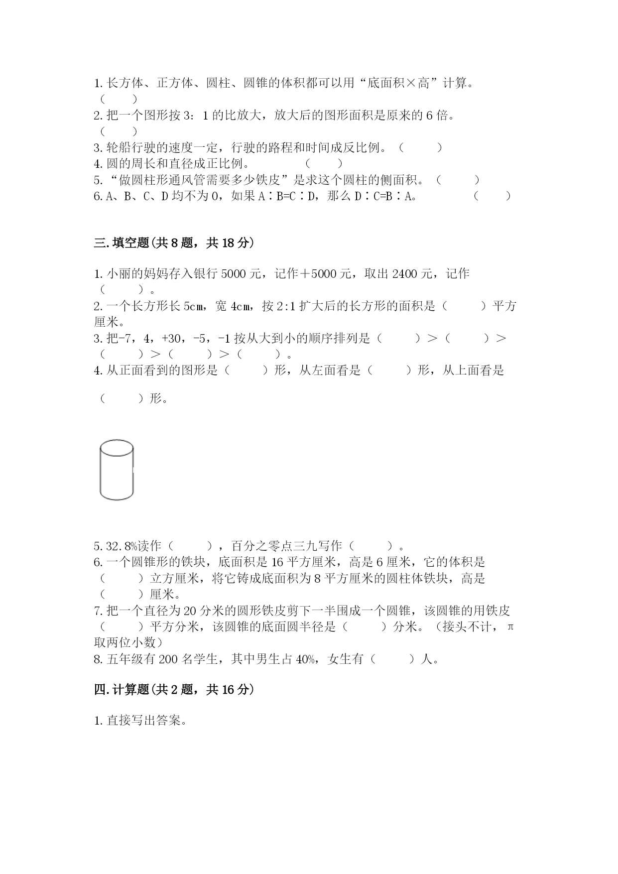 北京版数学六年级下册期末测试卷一.选择题(共6题,共12分)1.下面说法正确的是()。A.一条直线长10m。B.圆锥的体积比与它等底等高的圆柱的体积小。C.一年中有6个大月、6个小月。D.把一根木头锯成7段,若锯每一段所用的时间都相等,那么锯每一段的时间是锯完这根木头所用时间的。2.等底等高的圆柱、正方体、长方体的体积相比较()。A.一样大B.长方体体积大C.圆柱体体积大D.正方体体积大3.等底等高的圆柱、正方体、长方体的体积相比较,()。A.正方体体积大B.长方体体积大C.圆柱体体积大D.一样大4.一根