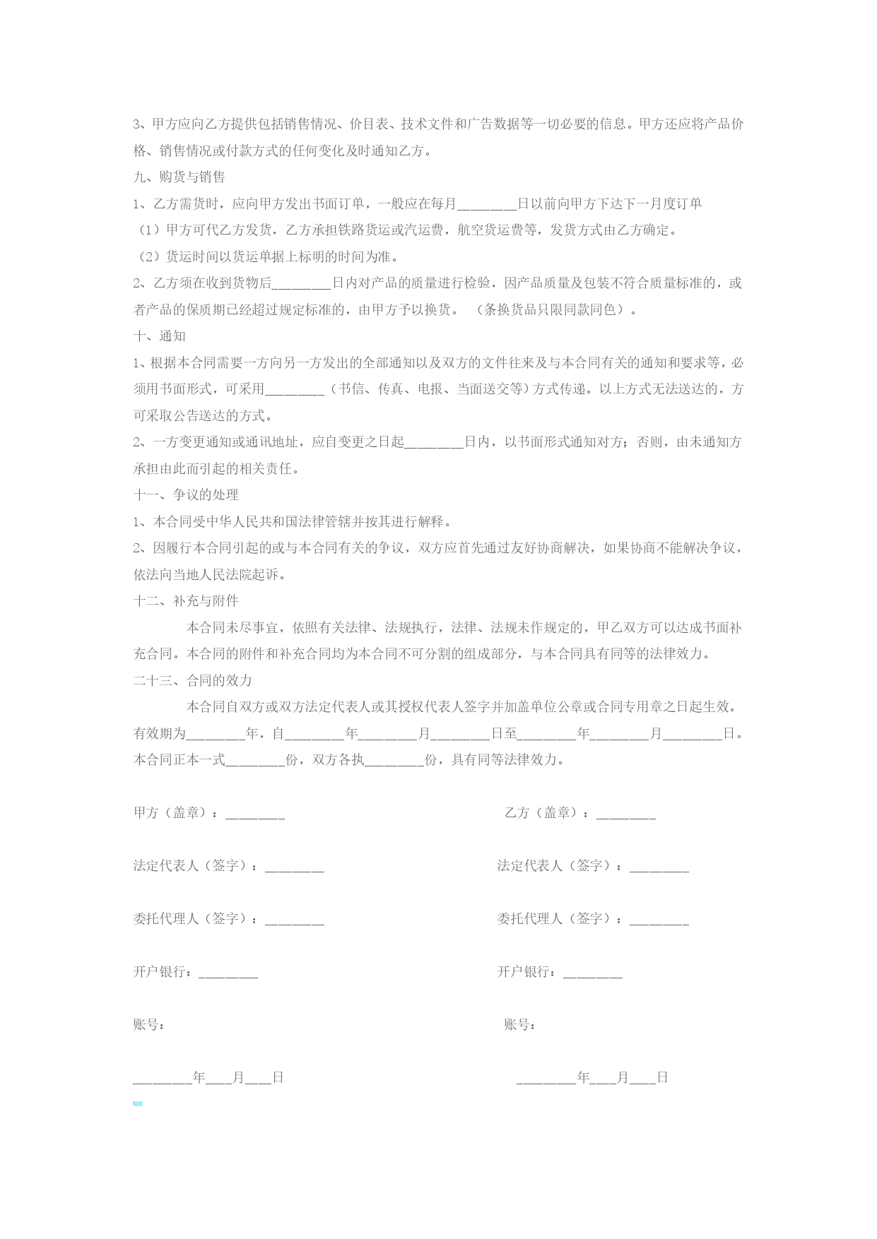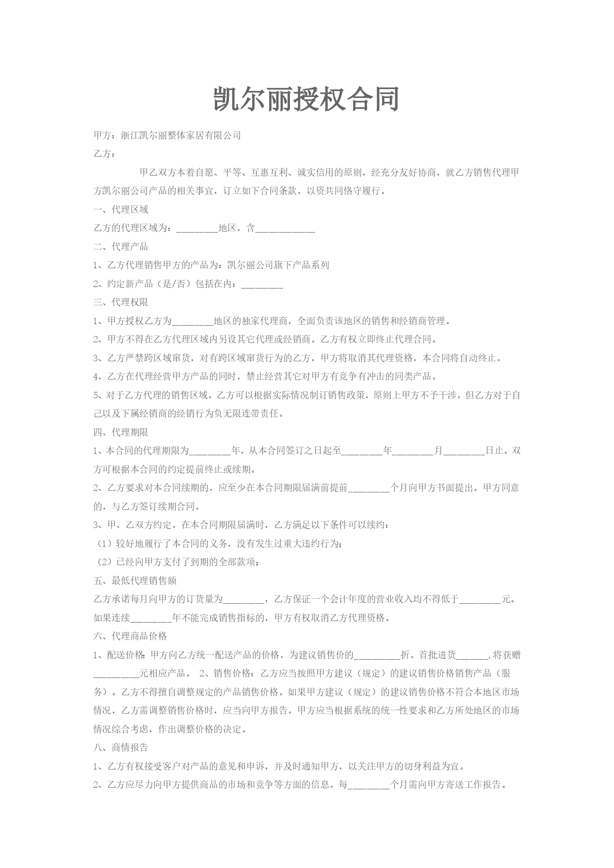凯尔丽授权合同甲方:浙江凯尔丽整体家居有限公司乙方:甲乙双方本着自愿、平等、互惠互利、诚实信用的原则,经充分友好协商,就乙方销售代理甲方凯尔丽公司产品的相关事宜,订立如下合同条款,以资共同恪守履行。一、代理区域乙方的代理区域为:_________地区,含_____________二、代理产品1、乙方代理销售甲方的产品为:凯尔丽公司旗下产品系列2、约定新产品(是/否)包括在内:_________三、代理权限1、甲方授权乙方为_________地区的独家代理商,全面负责该地区的销售和经销商管理。2、甲方不得在