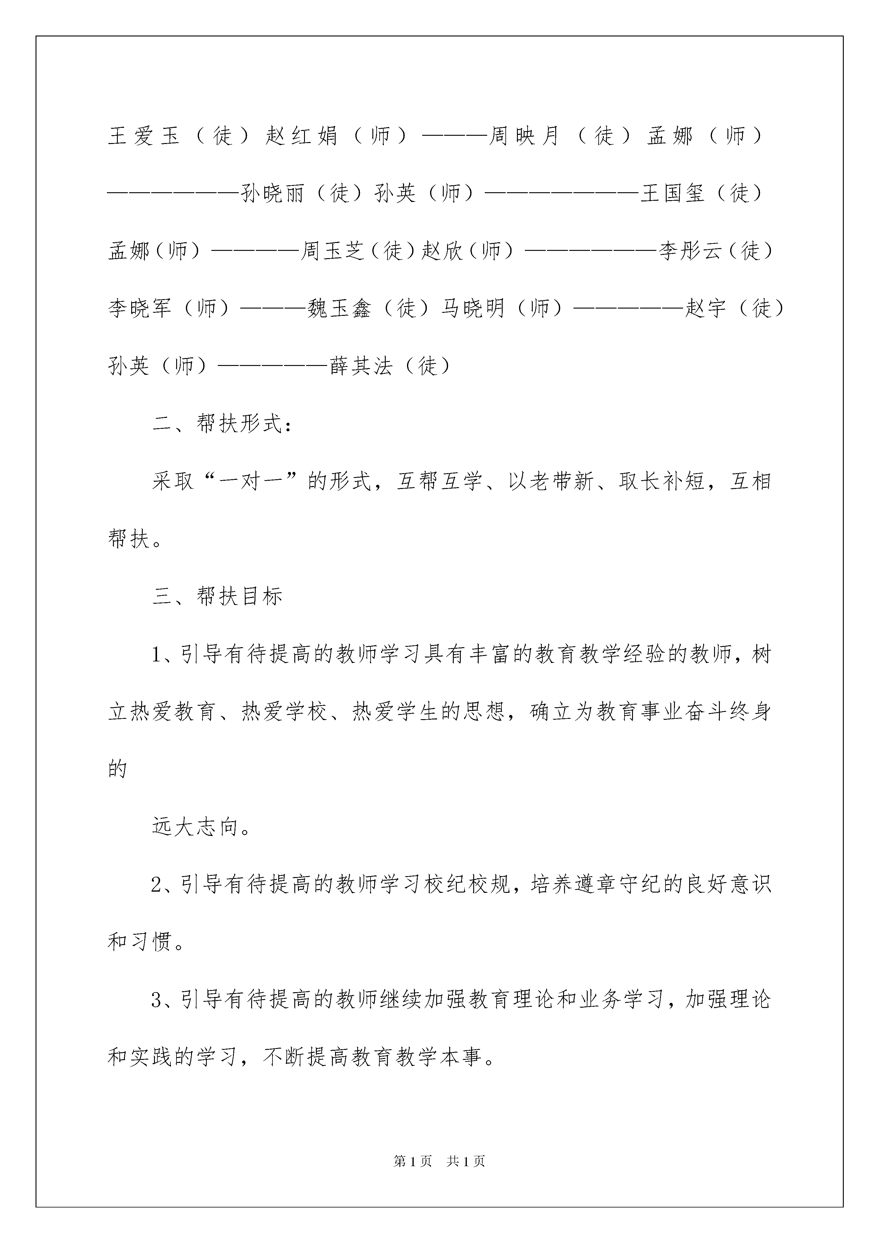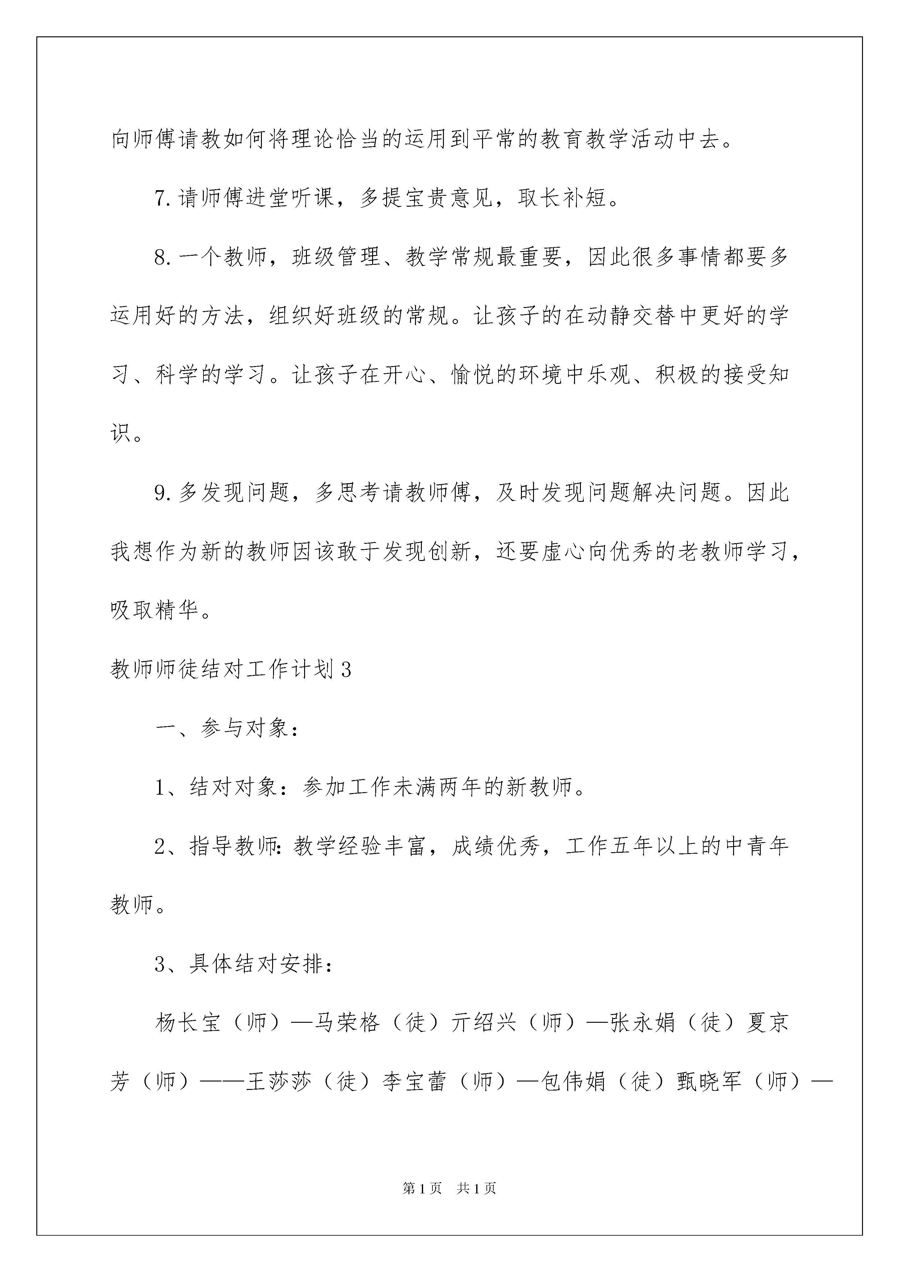 2022教师师徒结对工作计划教师师徒结对工作计划时间的脚步是无声的,它在不经意间流逝,我们又将接触新的知识,学习新的技能,积累新的经验,是时候开始写工作计划了。工作计划怎么写才能发挥它最大的作用呢?下面是我帮大家整理的教师师徒结对工作计划,仅供参考,欢迎大家阅读。教师师徒结对工作计划1一、学习内容:1.每月邀请师傅至少来听3节课,每个学期也至少去听师傅5节示范课。在交流中升华理念。3.和师傅一起观看优质课,一起讨论,深入领会名家的优秀教育教学理念。4.邀请师傅指点备课,每学期开设一节校内汇报课。5.经常和师傅沟通,探讨在教育教学上的疑惑和想法。6.同步进行教育教学中某方面的方法探究,积累案例、论文素材。7.在撰写案例和论文方面,经常向师傅请教,请师傅指点。8.平日里遇到什么教育教学当中的问题无法解决,主动和师傅交流。二、活动内容三月份:1.制定成长计划;2.与师傅交流教学中的想法;3.聆听师傅的课、交流;四月份:1.听师傅的课,并进行交流;2.准备一节信息技术与学科整合课3.共同阅读先进的教育理论书籍;4.邀请师傅随堂听课;五月份:1.共同探讨名家课例;2.和师傅交流教育教学中的困惑;3.邀请师傅随堂听课,评课;六、七月份:1.听师傅的课,并进行交流;2.与师傅交流教学中的想法3.共同阅读先进的教育理论书籍;4.完成个人总结。三、自我期望1.多学习:严格要求自己、认真工作、虚心学习;每学期至少读5本教育、教学方面的书,并做好笔记或摘抄。2.多交流:积极参加学科教研活动,充分利用网络等手段,增进与他人之间的相互交流、互相学习,达到共同进步。3.多听课:多学习先进的教学方法,学优秀的教育教学经验;提前一周备好课,认真上好每堂课。4.多反思:在平时的教育教学中多积累,多做课后反思,争取每课都有小反思,每学期至少写多篇教学论文或教学案例。5.认真理解钻研教材,努力备好课,并在实践中掌握教与学的内在联系。6.多开课:争取更多机会参加各种类型的开课活动,每学年争取上一节校级公开课。总之,在以后的工作中要不断地向师傅学习。加强自己的师德修养,要努力钻研业务,敬业爱生,为人师表,争取做一位优秀的教师,不断增加自身的人文底蕴,使自己在孩子的心目中永远有一种和蔼可亲的好老师。教师师徒结对工作计划2师傅:潘旭双徒弟:陈可鲜一、指导思想:为青年教师迅速、稳定地发展,缩短新教师的探索周期,发挥老教师的传、帮、带作用、促进新老教师之间相互学习,不断提高自身的教学水平和业务素质。我与陈可鲜(徒弟)结为师徒,为使师徒双方进一步明确自己的职责,增强责任感,现制定师徒结对活动师傅计划。二、实施目标:(一)师傅:规划好培训计划,理论学习心得交流,展示课教案,听课指导与简单评点,自我业务进修提高规划,论文撰写等内容。通过这样的活动,师傅既可以锻炼自己,把经验传授给徒弟又可以让徒弟从中汲取许多对教学有用的知识,丰富教学经验和阅历,增强师德修养、理论修养、教学和基本素养。在这过程中,确确实实让徒弟有所收获,交流心得,相互切磋。1.指导徒弟学习先进的教育教学理念。2.指导徒弟思考教育教学问题,有效地提高教学效率。3.指导学习如何积累案例、论文素材。4.本学期师傅和徒弟最少要完成一篇论文,力争获得好的名次。三、实施措施:(一)师傅:1.在师德、教风、业务水平和学科素养方面以身作则,起模范作用。教书育人,为人师表,热爱学生,热爱教育事业,树立高尚的师德形象。在师德、工作态度、教学业务等方面为徒弟做出榜样。要切实担负起对陈老师的辅导工作。2.指导徒弟熟练掌握教学常规;熟悉教学研究方法。3.师徒每学期要有至少四次的一对一具体教学指导,在备课、上课、组织考试各环节以及教学研究方面予悉心指导;平时经常互相听课(不少于15节),并遵循发展性评价的原则,客观评价徒弟的教学行为,提出改进建议。4.努力帮助徒弟提高教学技能和教育综合能力。5.本着教学相长、互动共进的原则,师徒分别学习一些与教育有关的书籍师徒相互交流。师徒两人要认真学习教育教学理论,写好学习笔记,努力提高理论水平,认真抓好教学过程中的基本环节,每学期至少开设一节汇报课。通过课题研究、案例分析、公开课教学研究等活动,使师徒双方都有新的提高。(二)徒弟:1.带着教学实际中需要解决的问题,或根据自己专业发展的需要或就自己面临的业务问题,有选择地与师傅进行交流;2.完成师徒协议中规定的任务,解决问题。3.努力提高教学技能和教育综合能力。4.克服教育教学中的低效行为或高原现象。5.积极探寻专业发展的新途径,采取新对策,在自我反思与行动研究中不断提高教学的有效性,在积累教学案例、叙事