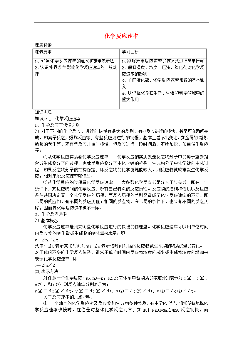 用心爱心专心化学反应速率课表解读课表要求学习目标1、知道化学反应速率的涵义和定量表示法2、认识外界条件影响化学反应速率的一般规律1、能够运用反应速率的定义式进行简单计算2、解释温度、浓度、压强、催化剂对化学反应速率的影响3、了解活化能、化学反应速率常数的基本涵义4、认识催化剂在生产、生活和科学领域中的重大作用知识再现知识点1、化学反应速率1、化学反应有快慢之别⑴对于不同的化学反应,进行的快慢有很大的差别,有些反应进行的很快,甚至可在瞬间完成,如离子反应,爆炸反应等;有些反应则进行的很慢,基本上看不出变化,