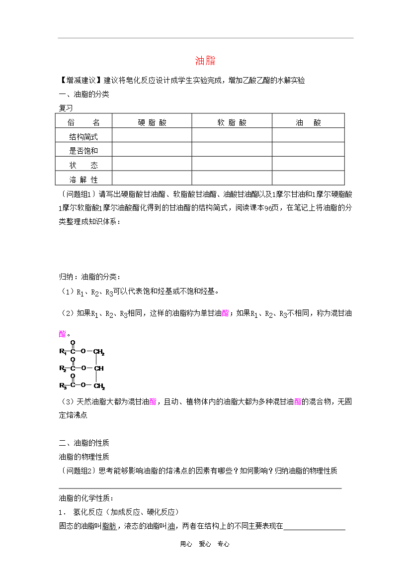 用心爱心专心油脂【增减建议】建议将皂化反应设计成学生实验完成,增加乙酸乙酯的水解实验一、油脂的分类复习俗名硬脂酸软脂酸油酸结构简式是否饱和状态溶解性〔问题组1〕请写出硬脂酸甘油酯、软脂酸甘油酯、油酸甘油酯以及1摩尔甘油和1摩尔硬脂酸1摩尔软脂酸1摩尔油酸酯化得到的甘油酯的结构简式,阅读课本96页,在笔记上将油脂的分类整理成知识体系:归纳:油脂的分类:(1)R1、R2、R3可以代表饱和烃基或不饱和烃基。(2)如果R1、R2、R3相同,这样的油脂称为单甘油酯;如果R1、R2、R3不相同,称为混甘油酯。(3)天