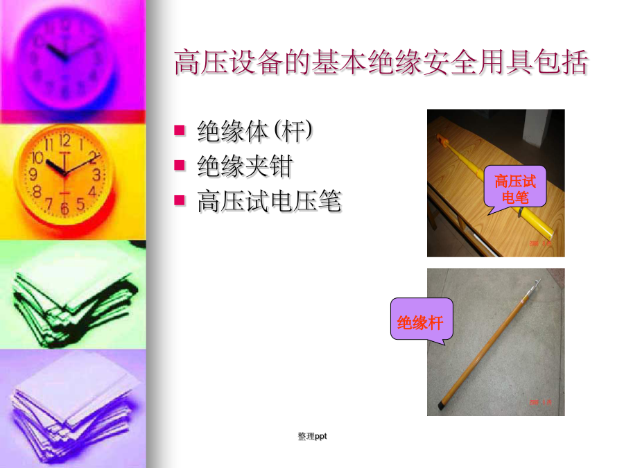 电工安全用具电工安全用具电工安全工具是用来直接保护电工人身安全的基本用具。电工安全用具分绝缘安全用具基本安全用具辅助安全用具一般防护安全用具绝缘安全用具分为两大类:一类是基本安全用具:它的绝缘强度高,用来直接接触高压带电体,足以耐受电器设备的工作电压,如高压绝缘拉杆(零克棒)、绝缘夹钳等。另一类是辅助安全用具:它的绝缘强度相对较低,不能作为直接接触带电体的用具使用,如绝缘手套、绝缘靴、绝缘鞋、绝缘垫、绝缘站台等。一、绝缘棒绝缘棒也称操作棒或绝缘拉杆。它主要用于断开或闭合高压隔离开关、跌落式熔断器、安装和拆