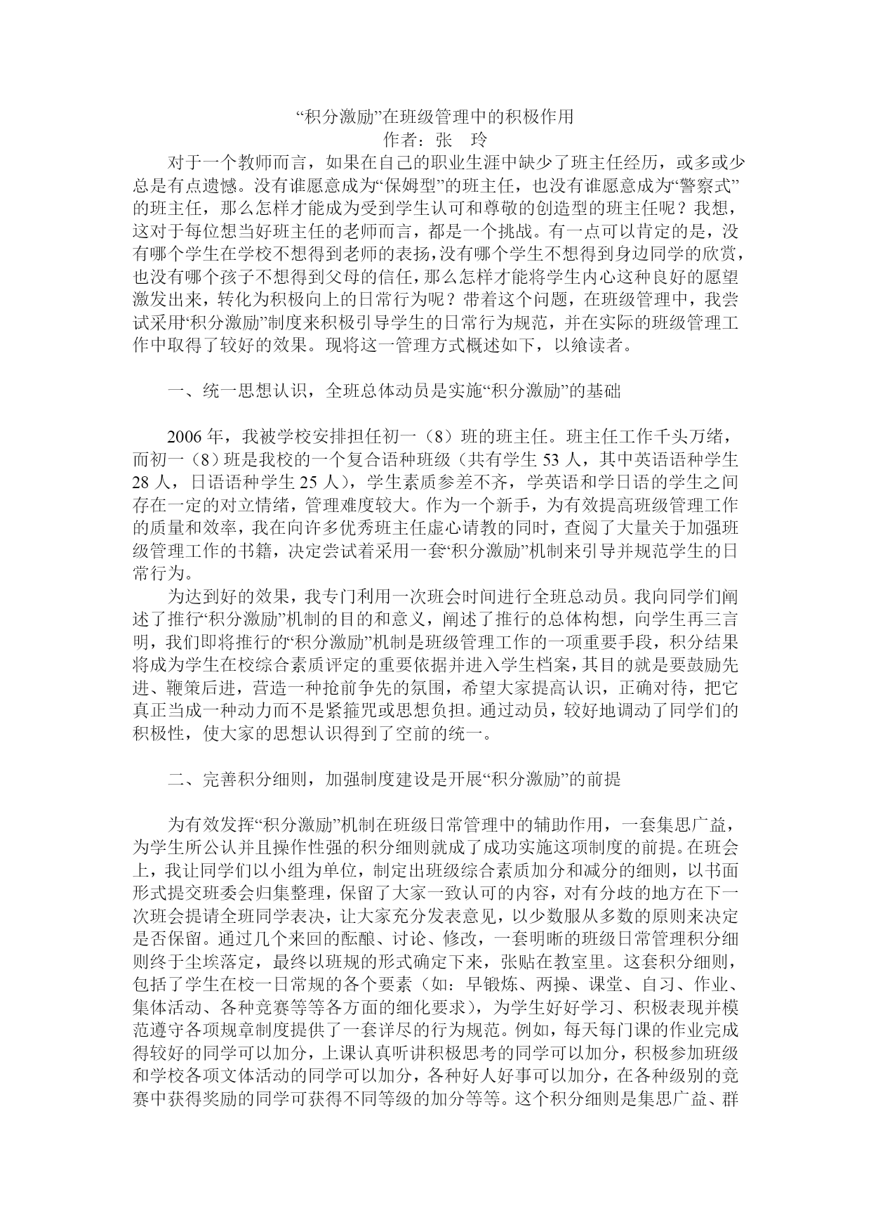 “积分激励”在班级管理中的积极作用作者:张玲对于一个教师而言,如果在自己的职业生涯中缺少了班主任经历,或多或少总是有点遗憾。没有谁愿意成为“保姆型”的班主任,也没有谁愿意成为“警察式”的班主任,那么怎样才能成为受到学生认可和尊敬的创造型的班主任呢?我想,这对于每位想当好班主任的老师而言,都是一个挑战。有一点可以肯定的是,没有哪个学生在学校不想得到老师的表扬,没有哪个学生不想得到身边同学的欣赏,也没有哪个孩子不想得到父母的信任,那么怎样才能将学生内心这种良好的愿望激发出来,转化为积极向上的日常行为呢?带着这