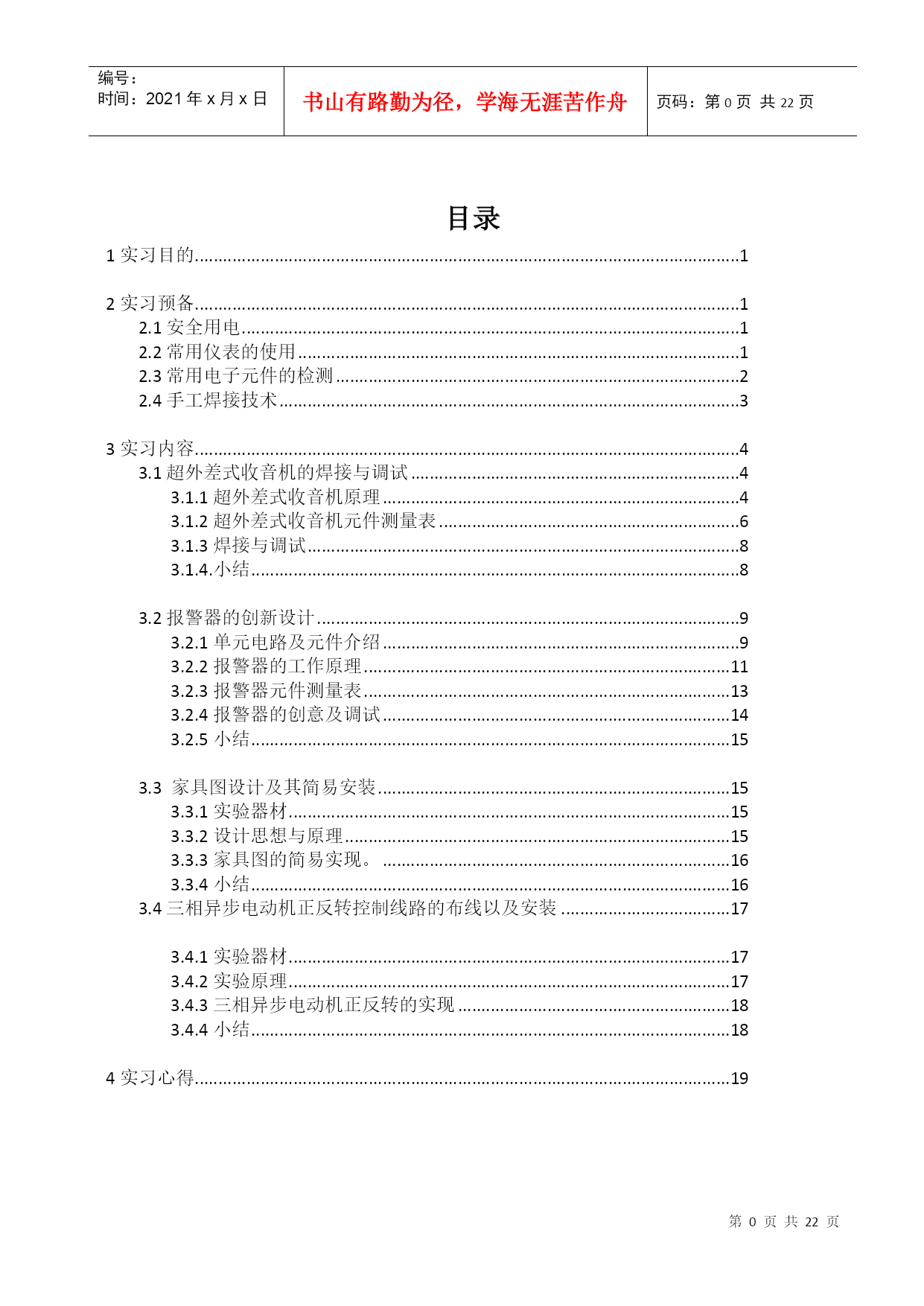 编号:时间:2021年x月x日书山有路勤为径学海无涯苦作舟页码:目录1实习目的12实习预备12.1安全用电12.2常用仪表的使用12.3常用电子元件的检测22.4手工焊接技术33实习内容43.1超外差式收音机的焊接与调试43.1.1超外差式收音机原理43.1.2超外差式收音机元件测量表63.1.3焊接与调试83.1.4.小结83.2报警器的创新设计93.2.1单元电路及元件介绍93.2.2报警器的工作原理113.2.3报警器元件测量表133.2.4报警器的创意及