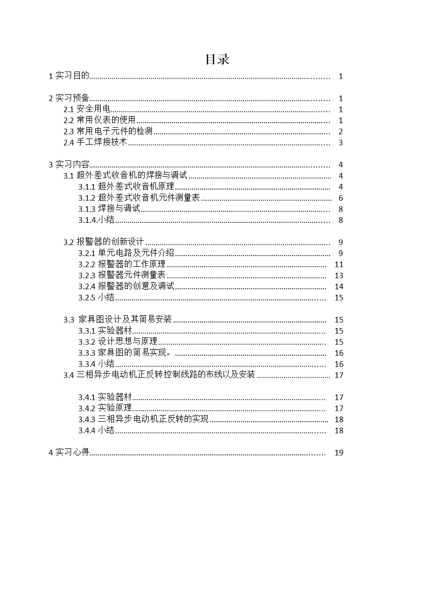 目录1实习目的12实习预备12.1安全用电12.2常用仪表的使用12.3常用电子元件的检测22.4手工焊接技术33实习内容43.1超外差式收音机的焊接与调试43.1.1超外差式收音机原理43.1.2超外差式收音机元件测量表63.1.3焊接与调试83.1.4.小结83.2报警器的创新设计93.2.1单元电路及元件介绍93.2.2报警器的工作原理113.2.3报警器元件测量表133.2.4报警器的创意及调试143.2.5小结153.3家具图设计及其简易安装153.3.1实验器材153.3.2设计思想与原理1