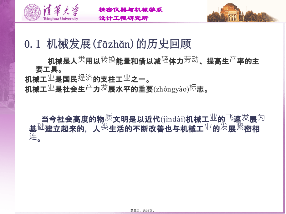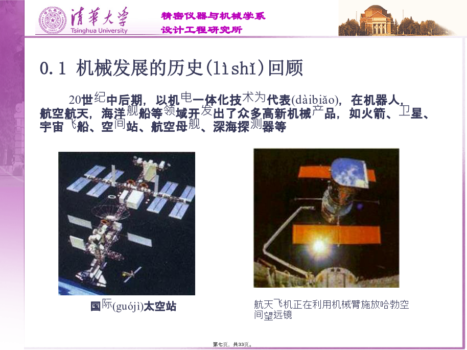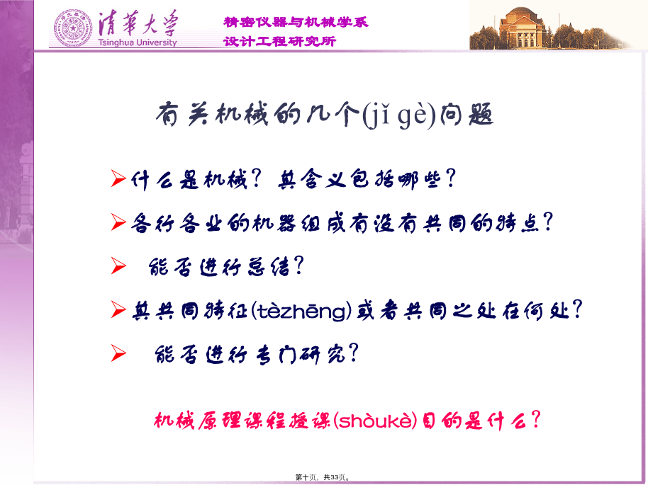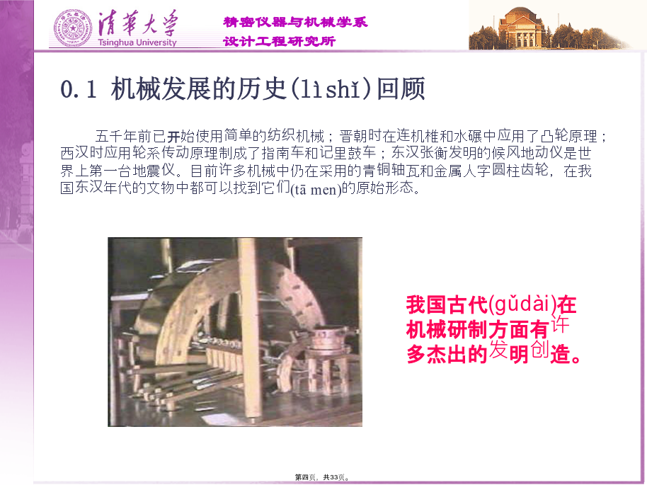 机械(jīxiè)原理绪论0.1机械发展(fāzhǎn)的历史回顾0.1机械发展的历史(lìshǐ)回顾0.1机械发展(fāzhǎn)的历史回顾0.1机械发展(fāzhǎn)的历史回顾0.1机械发展的历史(lìshǐ)回顾0.1机械发展的历史(lìshǐ)回顾0.1机械(jīxiè)发展的历史回顾有关机械的几个(jǐɡè)问题0.2机械原理课程研究(yánjiū)的对象0.2机械原理课程研究(yánjiū)的对象机构(jīgòu)机构(jīgòu)的共同特征:机器组成:原动机部分执行部分传动部分操纵(cā