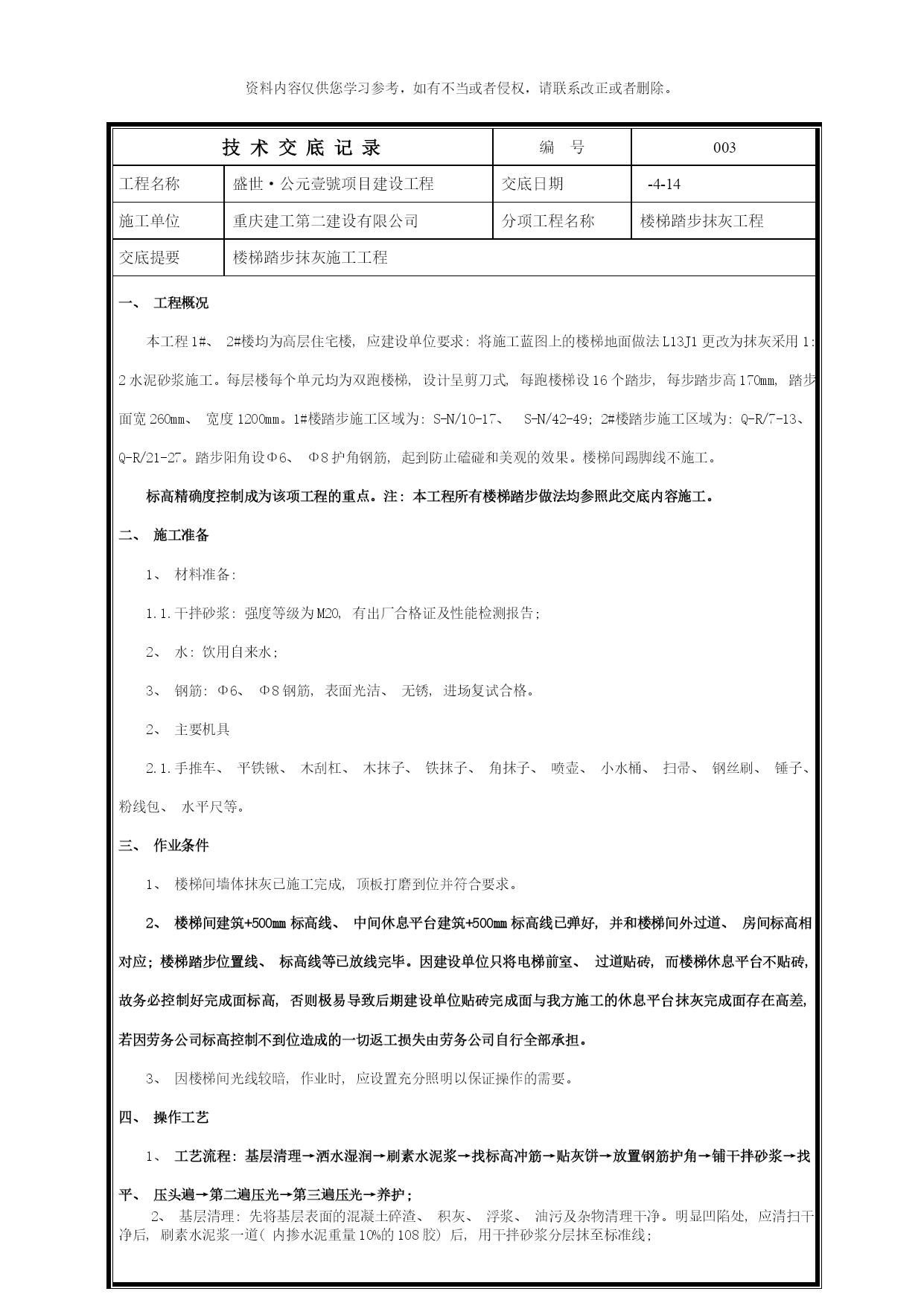 资料内容仅供您学习参考,如有不当或者侵权,请联系改正或者删除。技术交底记录编号003工程名称盛世·公元壹號项目建设工程交底日期-4-14施工单位重庆建工第二建设有限公司分项工程名称楼梯踏步抹灰工程交底提要楼梯踏步抹灰施工工程一、工程概况本工程1#、2#楼均为高层住宅楼,应建设单位要求:将施工蓝图上的楼梯地面做法L13J1更改为抹灰采用1:2水泥砂浆施工。每层楼每个单元均为双跑楼梯,设计呈剪刀式,每跑楼梯设16个踏步,每步踏步高170mm,踏步面宽260mm、宽度1200mm。1#楼踏步施工区域为:S-N/