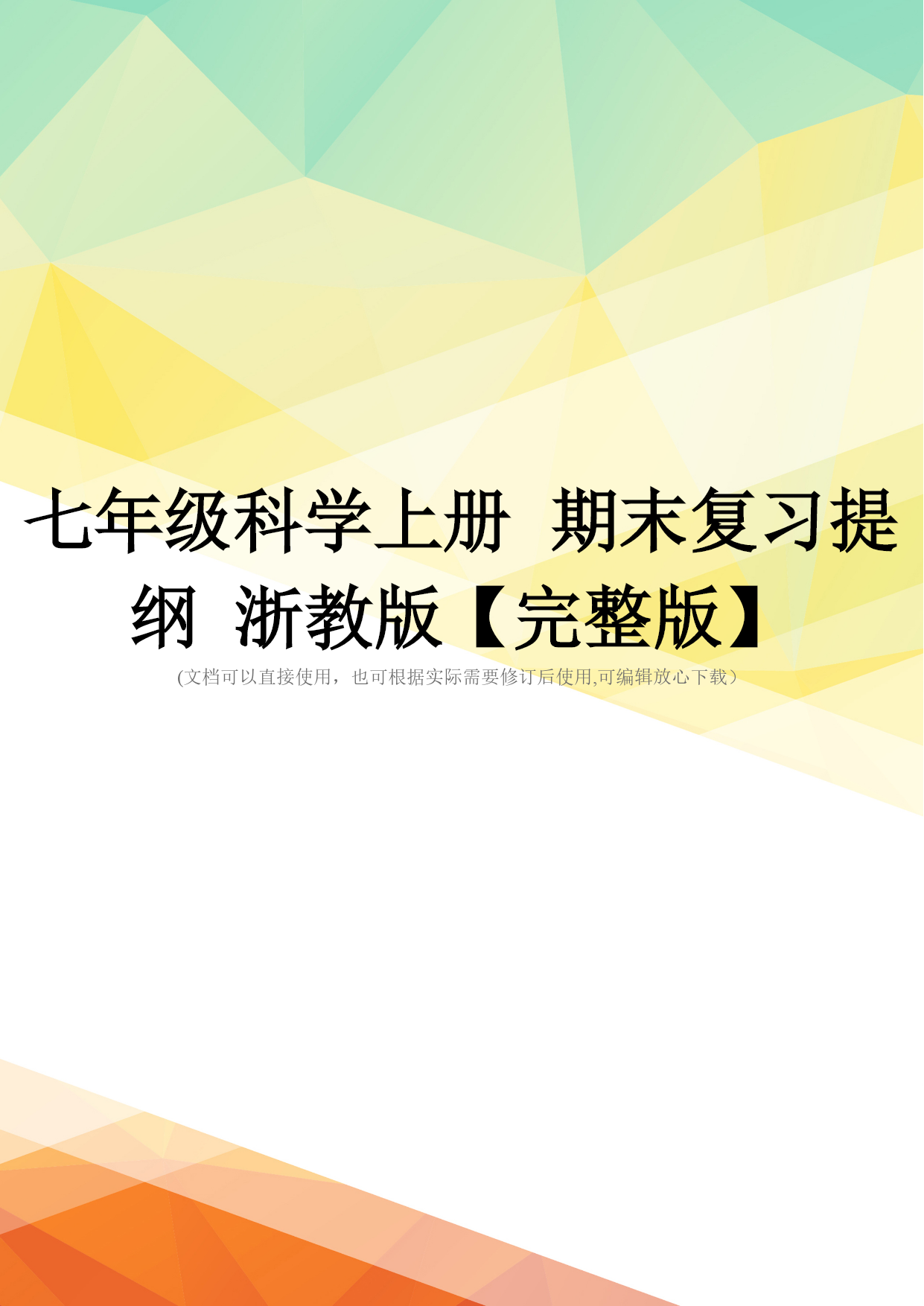 七年级科学上册期末复习提纲浙教版【完整版】(文档可以直接使用,也可根据实际需要修订后使用,可编辑放心下载)七年级上科学期末复习提纲第1章科学入门复习提纲第一节科学就在我们身边主要内容1.科学定义:科学是一门研究各种自然现象,并寻找它们相应答案的学问。2.学科学的根本方法:仔细观察、认真思考、积极探究实验。科学研究最重要的环节是实验。3.科学的重要性:科学技术促进了人类文明进步的同时也带来了负面影响,需要和谐开展科学技术。第2节实验和观察主要内容1.实验常用仪器的名称和用途:天平测量质量;温度计测量温度;停
