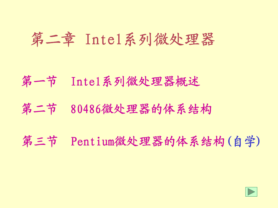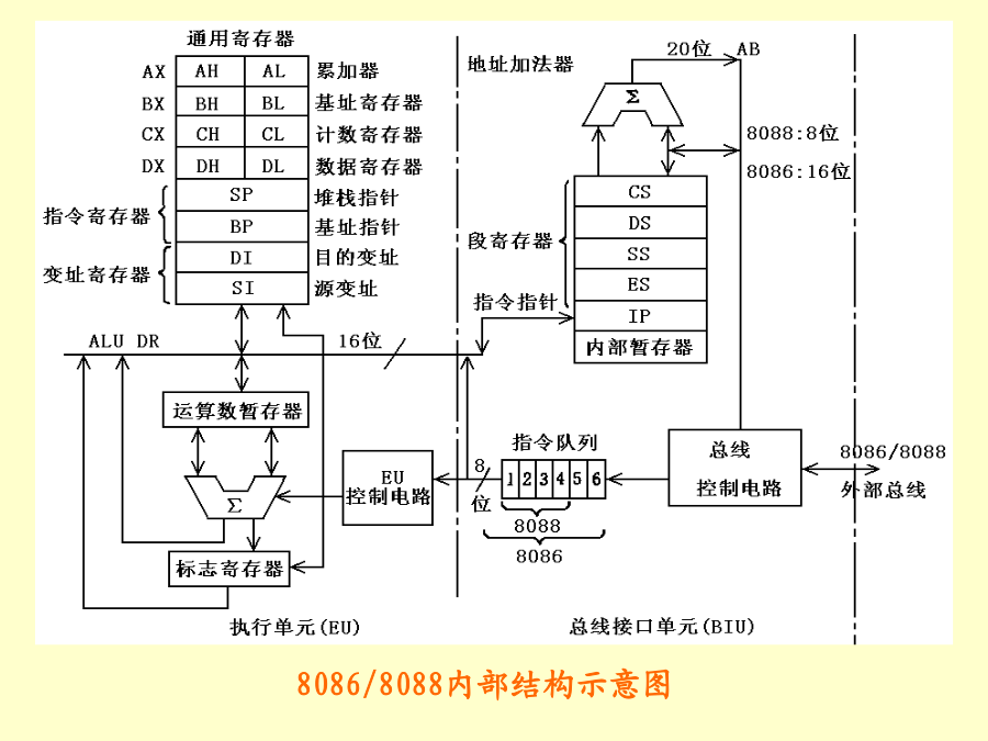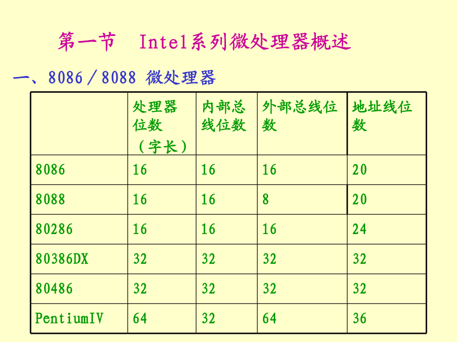 第二章Intel系列微处理器一、8086/8088微处理器一、8086/8088微处理器8086/8088内部结构示意图总线接口单元BIU由段寄存器(CS、DS、SS、ES)、指令指针寄存器(IP)、内部暂存器、指令队列、地址加法器及总线控制电路组成。它的主要作用是负责执行所有的“外部总线”操作。对存储器分段的理解对存储器分段的理解对存储器分段的理解存储器分段示意图段寄存器为8086/8088采用存储器分段管理提供了主要的硬件支持。8086/8088可寻址的存储器空间为1MB。通过分段管理,把1MB的物理