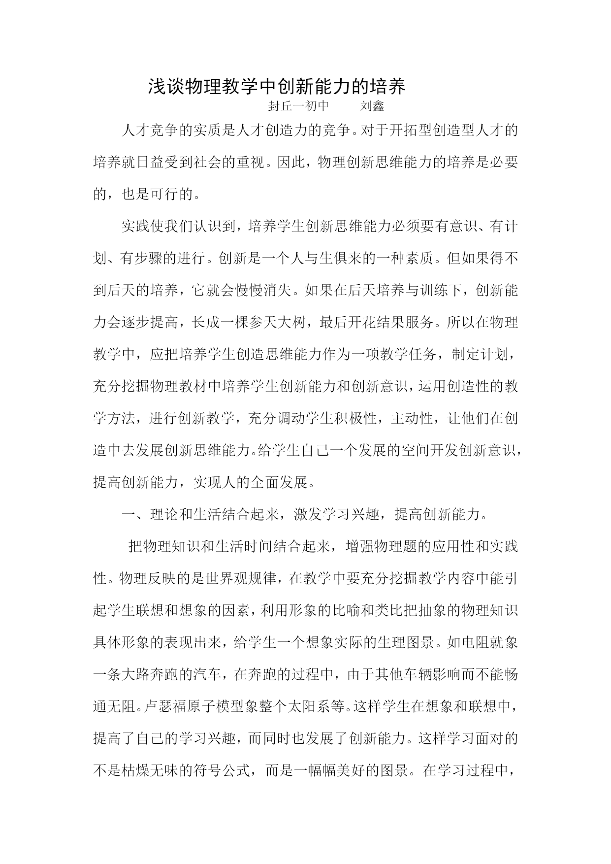 浅谈物理教学中创新能力的培养封丘一初中刘鑫人才竞争的实质是人才创造力的竞争。对于开拓型创造型人才的培养就日益受到社会的重视。因此,物理创新思维能力的培养是必要的,也是可行的。实践使我们认识到,培养学生创新思维能力必须要有意识、有计划、有步骤的进行。创新是一个人与生俱来的一种素质。但如果得不到后天的培养,它就会慢慢消失。如果在后天培养与训练下,创新能力会逐步提高,长成一棵参天大树,最后开花结果服务。所以在物理教学中,应把培养学生创造思维能力作为一项教学任务,制定计划,充分挖掘物理教材中培养学生创新能力和创新
