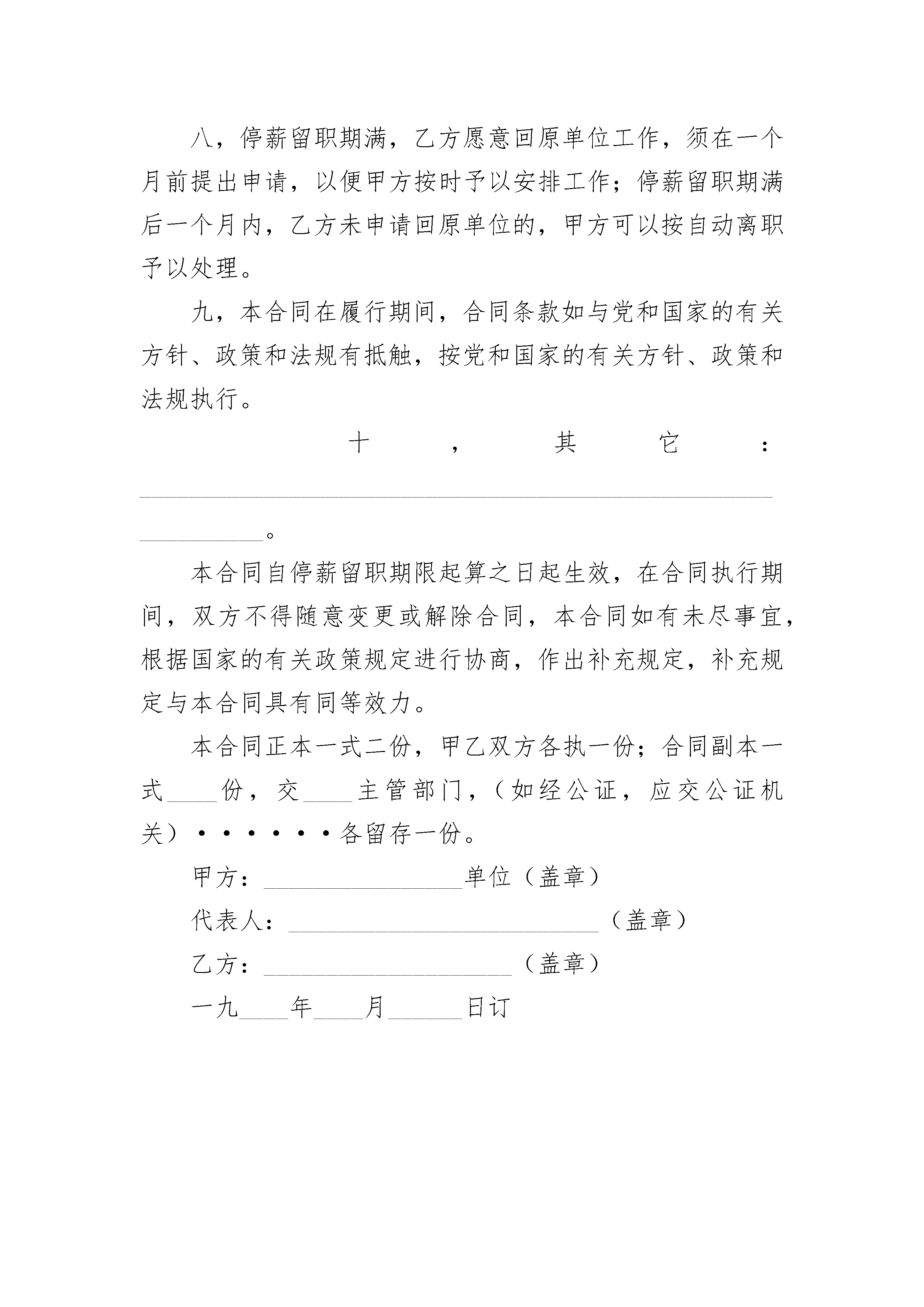 停薪留职协议书样式停薪留职协议书样式【1】甲方(用工单位):住址:乙方:身份证号:甲方因生产经营需要,经考核,录用乙方×××(姓名)为×××(工种名称)工人,遵照国家有关劳动法律法规,经双方协商,签订本合同。第一条甲方录用乙方从事×××(工种名称)。第二条劳动合同期限从××年×月×日起至××年×月×日时止。其中试用期限为××个月,至××年×月×日止。第三条甲方的基本权利和义务是:一、根据生产经营的需要和本单位的规章制度及本合同的各项条款对乙方进行管理。二、保护乙方的合法权益,按规定付给乙方工资、奖金、津贴
