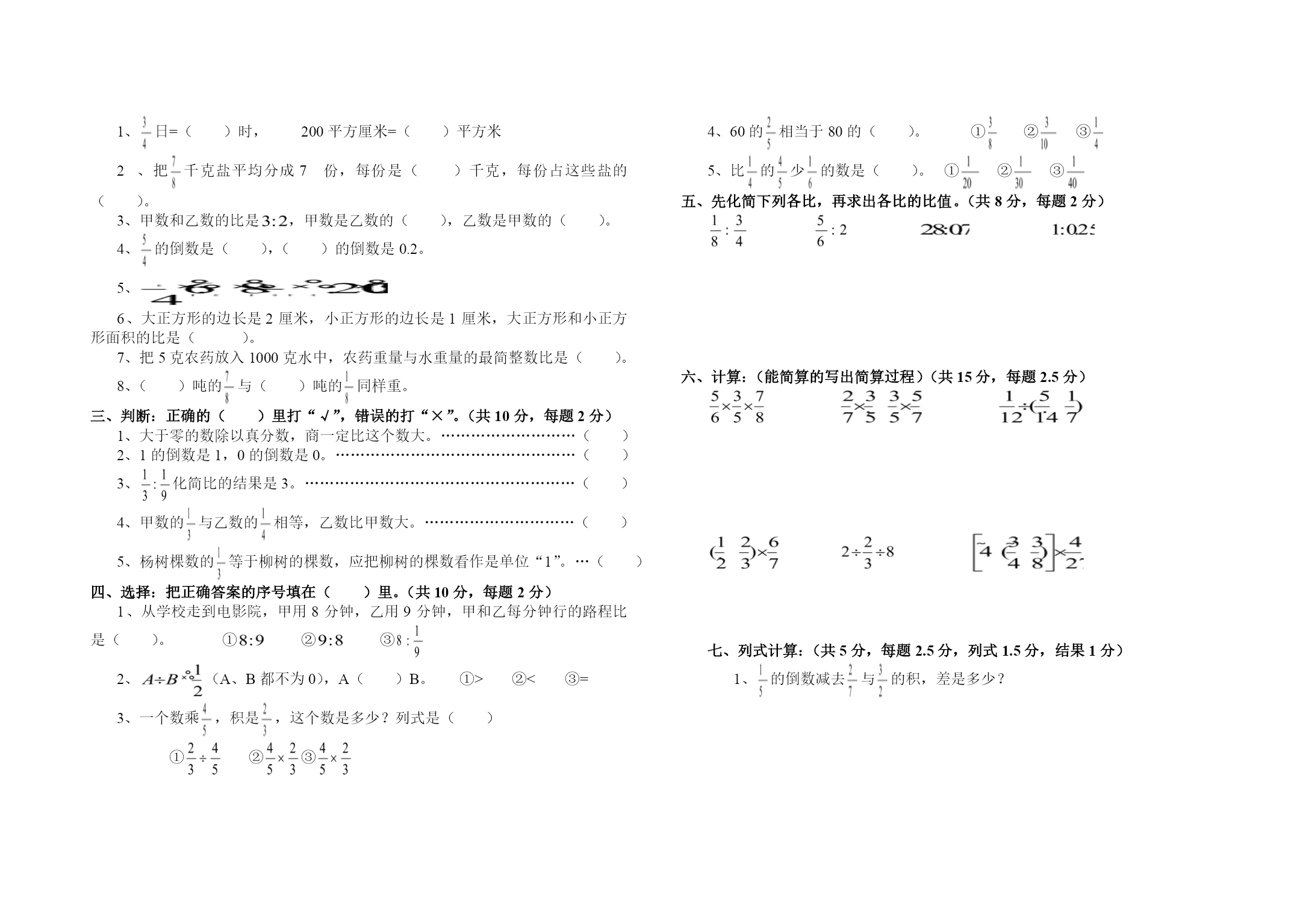 NIGARA小学六年级数学期中试卷概念题:(30分)动脑填空:(每空1分,共16分)1、7×EQ\F(3,5)表示();EQ\F(3,5)×7表示()2、15分=()时EQ\F(1,4)吨=()千克3、把一根4米长的绳子平均分成7段,每段长EQ\F((),())米,每段占总长的EQ\F((),())。4、EQ\F((),20)=0.5=9÷()=():405、EQ\F(3,8):EQ\F(1,5)化成最简单的整数比是(),比值是()。6、10米减去EQ\F