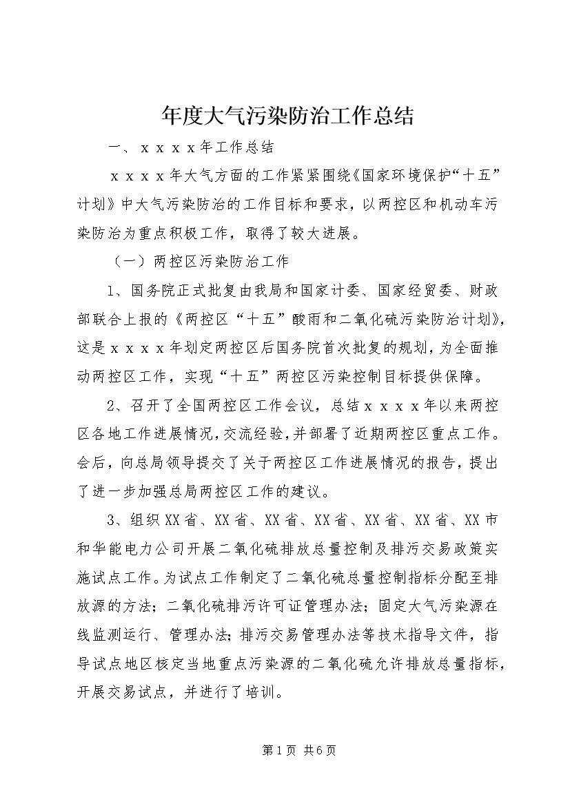 年度大气污染防治工作总结一、xxxx年工作总结xxxx年大气方面的工作紧紧围绕《国家环境保护“十五”计划》中大气污染防治的工作目标和要求,以两控区和机动车污染防治为重点积极工作,取得了较大进展。(一)两控区污染防治工作1、国务院正式批复由我局和国家计委、国家经贸委、财政部联合上报的《两控区“十五”酸雨和二氧化硫污染防治计划》,这是xxxx年划定两控区后国务院首次批复的规划,为全面推动两控区工作,实现“十五”两控区污染控制目标提供保障。2、召开了全国两控区工作会议,总结xxxx年以来两控区各地工作进展情况,