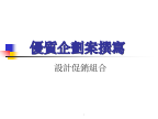 優質企劃案撰寫目錄第一節促銷組合通論第二節發展有效溝通的步驟一、確定目標視聽眾二、決定溝通目標三、設計訊息四、選擇溝通通路四、選擇溝通通路五、建立整體促銷預算銷售百分比法※單位固定金額法※競爭對等法第三節促銷組合種類種類二、設定促銷組合之因素二、設定促銷組合之因素二、設定促銷組合之因素第四節促銷組合工具第四節促銷組合工具1.廣告1-2廣告預算的決定在生命週期中的階段廣告頻率市場佔有率與消費者基礎競爭與混亂─在不同媒體大量的干擾之下,想突破重圍讓消費者認知公司品牌,需要更大量的金錢與特色才行。產品替代性目標