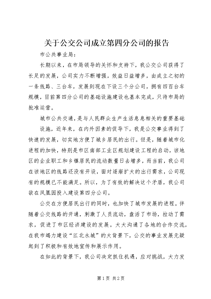 关于公交公司成立第四分公司的报告市公共事业局:长期以来在市局领导的关怀和支持下我公交公司获得了长足的发展公司实力不断增强效益日益增多由成立之初的一条线路、三台车发展到现在下设三个分公司拥有四百台车规模目前第四分公司的基础设施建设也基本完成只待市局的批准运营。城市公共交通是与人民群众生产生活息息相关的重要基础设施近年来在内外因素的促导下我是公交事业得到了快速的发展切实地方便了城乡居民的出行。但是随着城市化进程的加快特别是市区南部工业区规划建设工程的启动该地