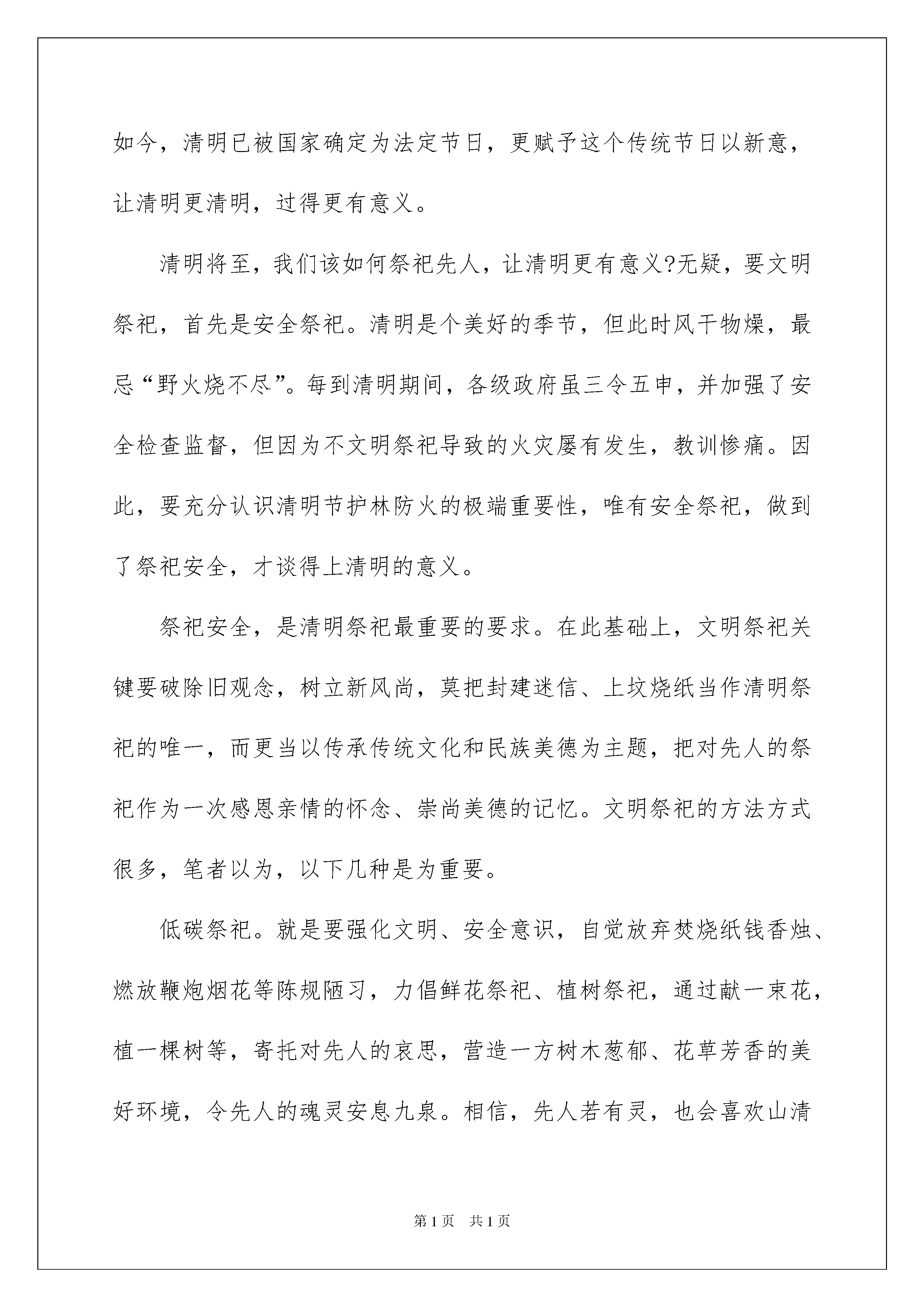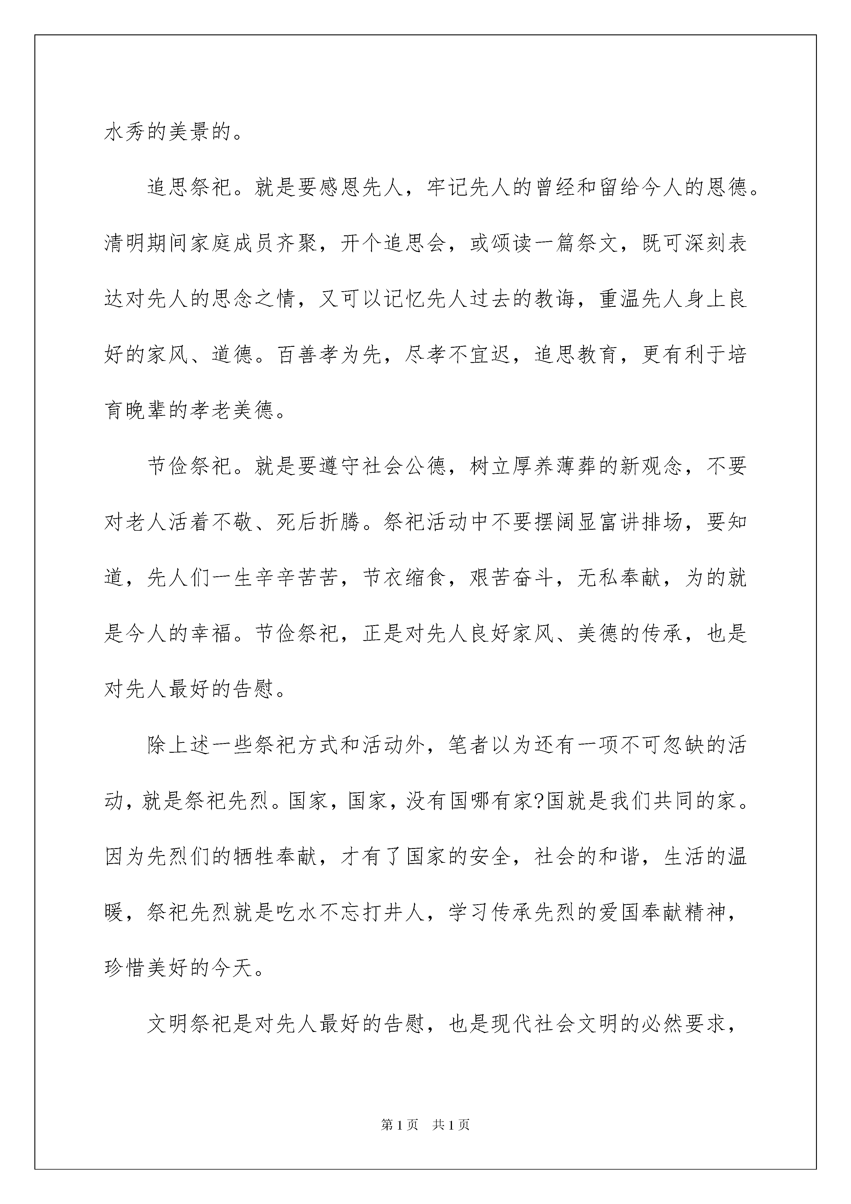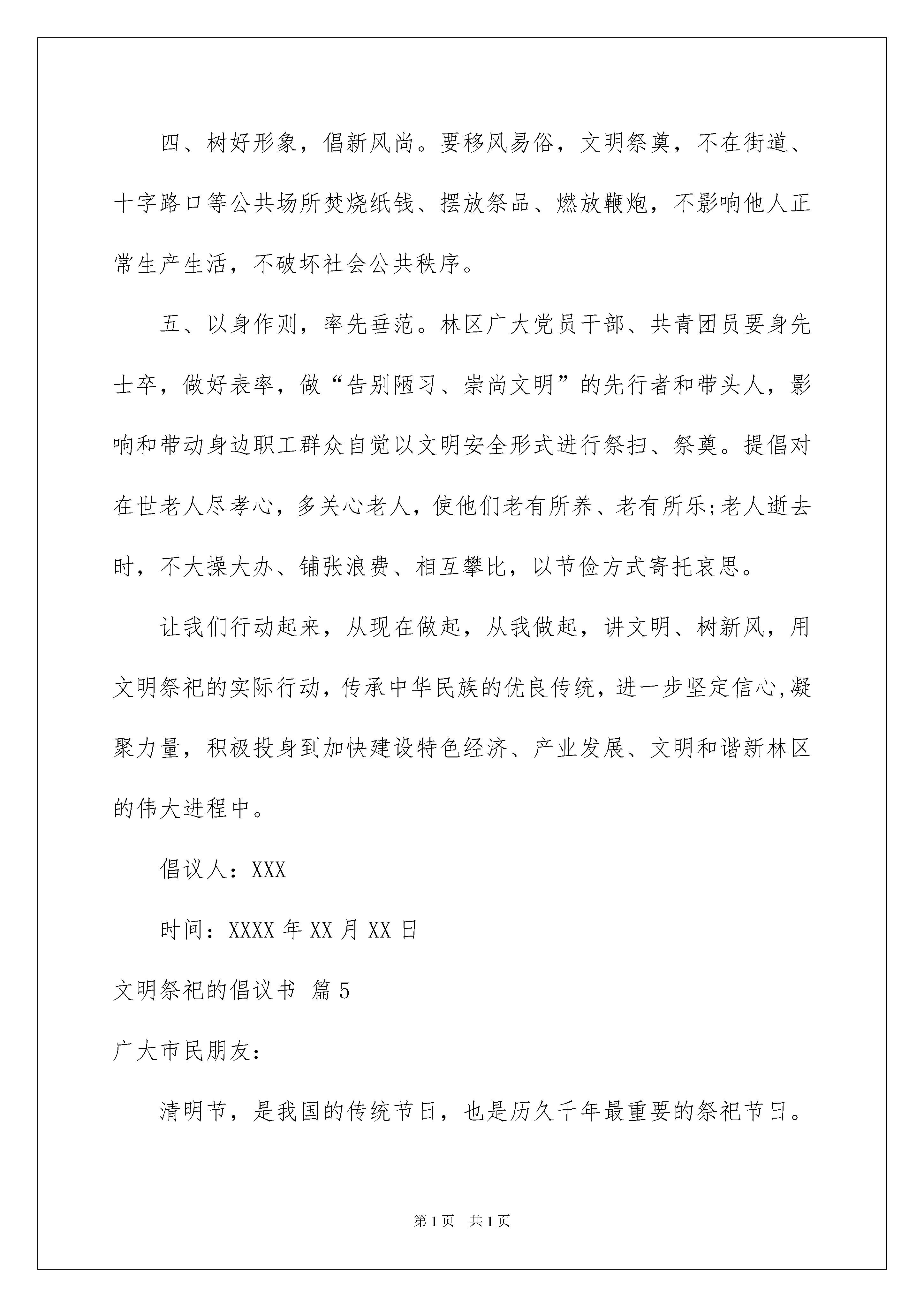 2022文明祭祀的倡议书锦集5篇文明祭祀的倡议书锦集5篇在快速变化和不断变革的新时代,越来越多人会去使用倡议书,使用正确的写作思路书写倡议书会更加事半功倍。那么你有了解过倡议书吗?下面是我整理的文明祭祀的倡议书5篇,希望对大家有所帮助。文明祭祀的倡议书篇1XXX为大力弘扬中华民族传统文化,推进移风易俗,树立文明新风,倡导绿色殡葬、文明祭祀,确保市民朋友在安全、文明、和谐、有序的环境中祭奠亲人,我们特向辖区居民发出倡议:一、倡导文明祭奠新风。自觉破除焚烧纸钱香烛等陈规陋习,摒弃带有封建迷信色彩的拜祭活动,大力倡导鲜花祭奠、植树祭奠、网上祭奠、家庭追思会等文明健康的祭奠方式。二、强化社会公德意识。注重生态、环保、低碳,在扫墓祭奠过程中不乱扔杂物,不破坏草地树木,不污染空气河流,自觉维护环境的优美整洁。三、自觉遵守法律法规。在市区禁放区域内不购买、燃放烟花爆竹,不制造产生噪音,严格遵守有关防火规定,不违规用火。四、坚持文明出行交往。提倡乘坐公交车或步行前往扫墓地点,如驾车出行,要相互礼让,自觉遵守有关部门管理疏导,避免发生安全事故。广大市民朋友们,让我们迅速积极行动起来,把清明祭祀活动净化为怀念先辈亲人、传承历史文化、塑造时代精神的文明行为,让清明节成为更加安全、文明、和谐的节日,从现在做起,从我做起,用文明缅怀、关爱社会、关爱自然、关爱他人的实际行动,展示福州市民良好的精神风貌,为建设文明福州做出我们的贡献。倡议人:XXX时间:XXXX年XX月XX日文明祭祀的倡议书篇2风起正清明,开轩览物华。清明节既是广大市民缅怀英烈、祭奠先人的传统节日,也是万物生长,创新发展的绿色季节。为传承中华民族优秀传统文化,培育和弘扬社会主义核心价值观,引导广大市民过一个守法、绿色、有序、文明的清明节,市文明办、市民政局共同发出倡议:一、守法祭祀。遵守相关法律法规,加强自我约束,不在道路、广场、公园、绿地、居民小区等公共场所焚烧冥纸、不抛撒纸钱,自觉抵制封建迷信行为;不在墓地、山林等易引发火灾场所烧纸、燃放鞭炮;不携带火种和易燃易爆物品进入林区,防止引发火灾事故。二、绿色祭祀。倡导厚养薄葬的文明理念,更新传统殡葬观念,鼓励选择骨灰海葬、树葬、花葬等生态葬法,推广小型墓、壁葬、寄存等节地葬式,节约土地资源,不破坏环境,为子孙后代多留绿水青山、碧海蓝天。三、有序祭祀。合理安排祭扫日程和路线,避免祭扫人群过度集中,互谅互让。尽量选择乘坐公共交通工具,减少自驾车辆出行,遵守治安、交通秩序,服从引导和管理,避免造成人流车流拥堵,维护良好的城市秩序。市民朋友们,让我们用文明祭祀实际行动,彰显守法自尊、崇尚奉献、互助互爱、文明和谐,反对不守法纪、不重公德、损人利己、罔顾正义,弘扬城市文明风尚,共度一个守法、绿色、有序、文明的清明节。文明祭祀的倡议书篇3xxx:清明是中国人传统的节日,是祭祀先祖、先烈和扫墓的日子,寄托哀思,对逝者的`敬仰,让心灵得到感恩、宽慰、净化。形式本不重要,重要的是延续清明文化,感恩、告慰一代代为人类文明进步,为民族国家的利益而献身的人们,还有那些看似渺小,曾经拥有过的生命。然而,当下烧纸钱、纸制品等一些清明祭扫陋习却比较盛行。雾霾天气笼罩的今天,我们应深思如何文明祭扫。祭扫先祖是一种对先人的尊重和和哀悼,是表达思念的最好方式,更是中华民族的传统美德。但是很多形式主义的东西依然充斥其中,以往每到清明,鞭炮齐鸣、纸灰满天,这些都浪费了大量的资源的同时也污染了空气,不利于生态文明建设。我们应该倡导文明参加清明祭扫活动,比如在墓前献上一束花,敬上一杯薄酒,以寄托哀思,也可以栽上一棵树,既庄严节俭,又绿化环境;以这些方式取代传统方式,能够节约资源的同时,使清明节更“清明”,使祭扫活动更加安全、文明、和谐、有序。随着人们生活水平的提高,在这样一个传统节日里,很多人都选择驾车出行,这无疑为交通增添了很大的压力,不仅容易造成交通拥堵,更容易造成交通事故,这不是我们愿意看到的。所以要避免这种情况,应该听从交通部门指挥,尽量选择公共交通或错峰出行,如自驾出行,及时收听交通广播电台,随时了解景区、墓区周边的路况信息,通过时时路况计划行经路线,有效避堵,完成通行。在和谐畅通的环境下祭扫也是对社会、对自己最好的尊重。文明祭扫,从我做起,从现在做起,从小事做起。我们要在缅怀先人、寄托哀思的过程中维护城市的和谐和畅通,让我们的城市真正在“全国文明城市”的道路上越走越远!倡议人:XXX时间:XXXX年XX月XX日文明祭祀的倡议书篇4林区广大职工居民同志们:清明节将至,在这缅怀先烈、先祖、铭记历史,寄托哀思的时节,为弘扬中