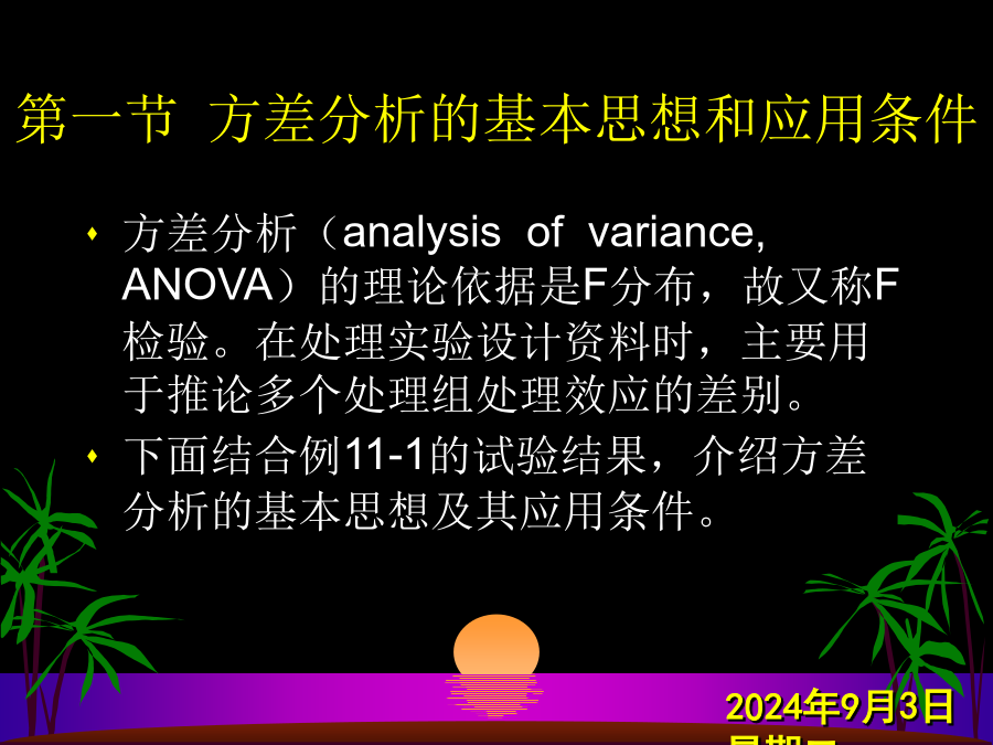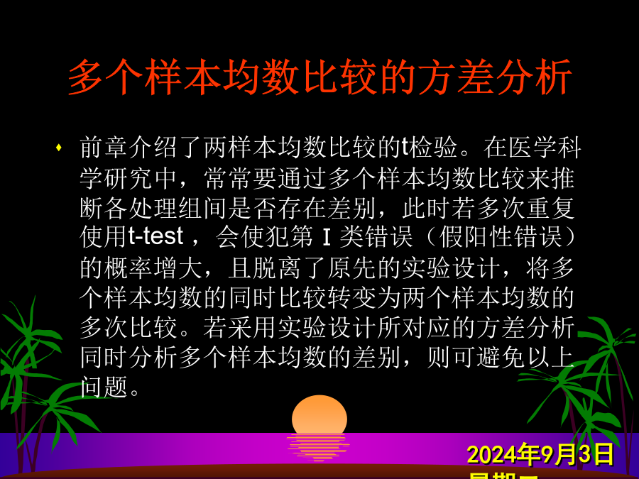 第三章介绍了两个样本均数()比较的t检验方法本章介绍多个样本均数()比较的方差分析方法。基本思想及应用条件2、应用条件:1)各样本是相互独立的随机样本2)各样本来自正态总体3)各处理组总体方差相等,即方差齐完全随机设计资料的方差分析完全随机设计资料的方差分析完全随机设计资料在进行统计分析时,需根据数据的分布特征选择方法,对于正态分布且方差齐同的资料,常采用完全随机设计的单因素方差分析(one-wayANOVA)或成组资料的t检验(g=2);对于非正态分布或方差不齐的资料,可进行数据变换或采用Wilcoxo