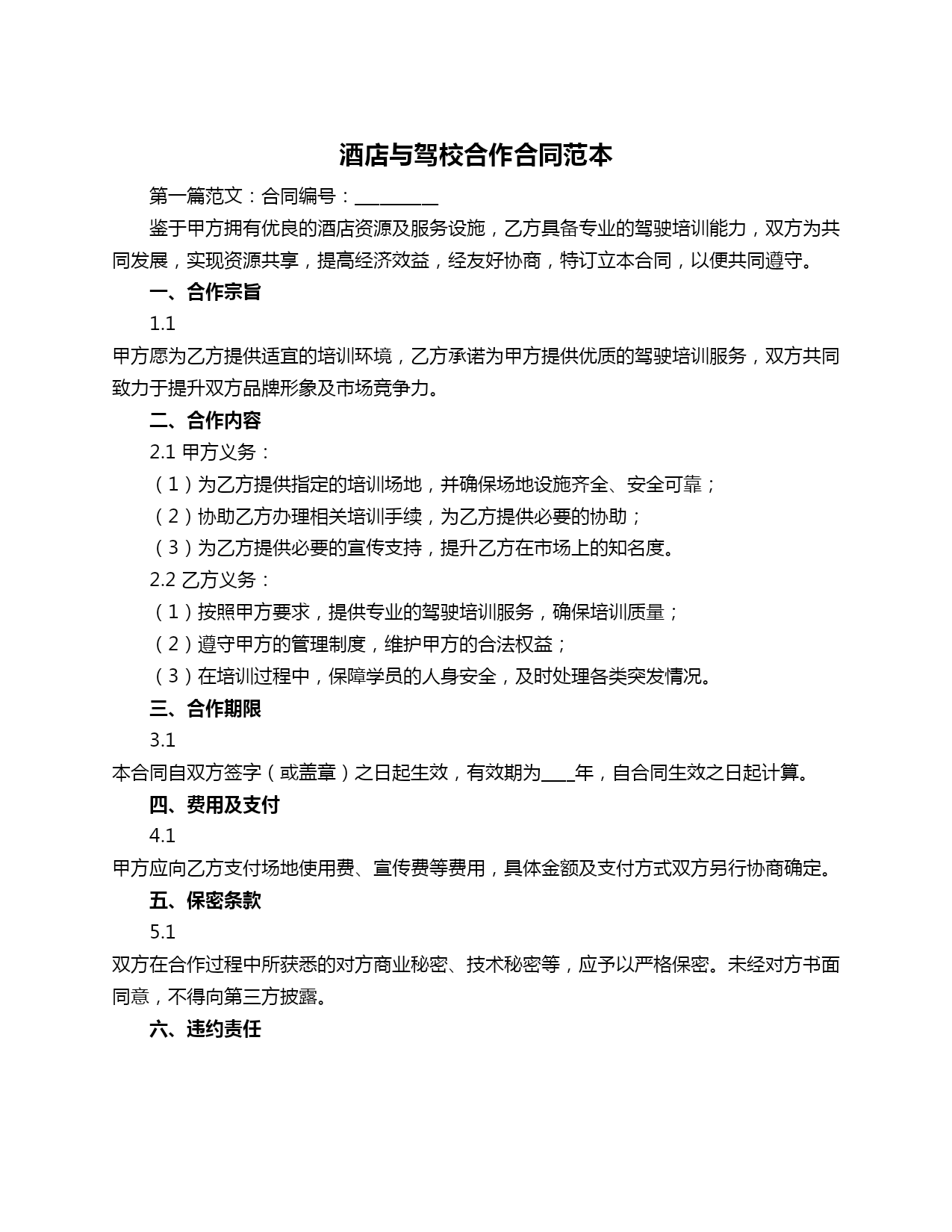酒店与驾校合作合同范本第一篇范文:合同编号:__________鉴于甲方拥有优良的酒店资源及服务设施,乙方具备专业的驾驶培训能力,双方为共同发展,实现资源共享,提高经济效益,经友好协商,特订立本合同,以便共同遵守。一、合作宗旨1.1甲方愿为乙方提供适宜的培训环境,乙方承诺为甲方提供优质的驾驶培训服务,双方共同致力于提升双方品牌形象及市场竞争力。二、合作内容2.1甲方义务:(1)为乙方提供指定的培训场地,并确保场地设施齐全、安全可靠;(2)协助乙方办理相关培训手续,为乙方提供必要的协助;(3)为乙方提供必要