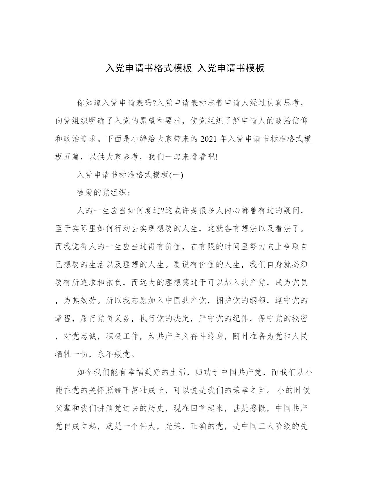 入党申请书格式模板入党申请书模板你知道入党申请表吗?入党申请表标志着申请人经过认真思考,向党组织明确了入党的愿望和要求,使党组织了解申请人的政治信仰和政治追求。下面是小编给大家带来的2021年入党申请书标准格式模板五篇,以供大家参考,我们一起来看看吧!入党申请书标准格式模板(一)敬爱的党组织:人的一生应当如何度过?这或许是很多人内心都曾有过的疑问,至于实际里如何行动去实现想要的人生,这就各有想法以及看法了。而我觉得人的一生应当过得有价值,在有限的时间里努力向上争取自己想要的生活以及理想的人生。要说有价值的