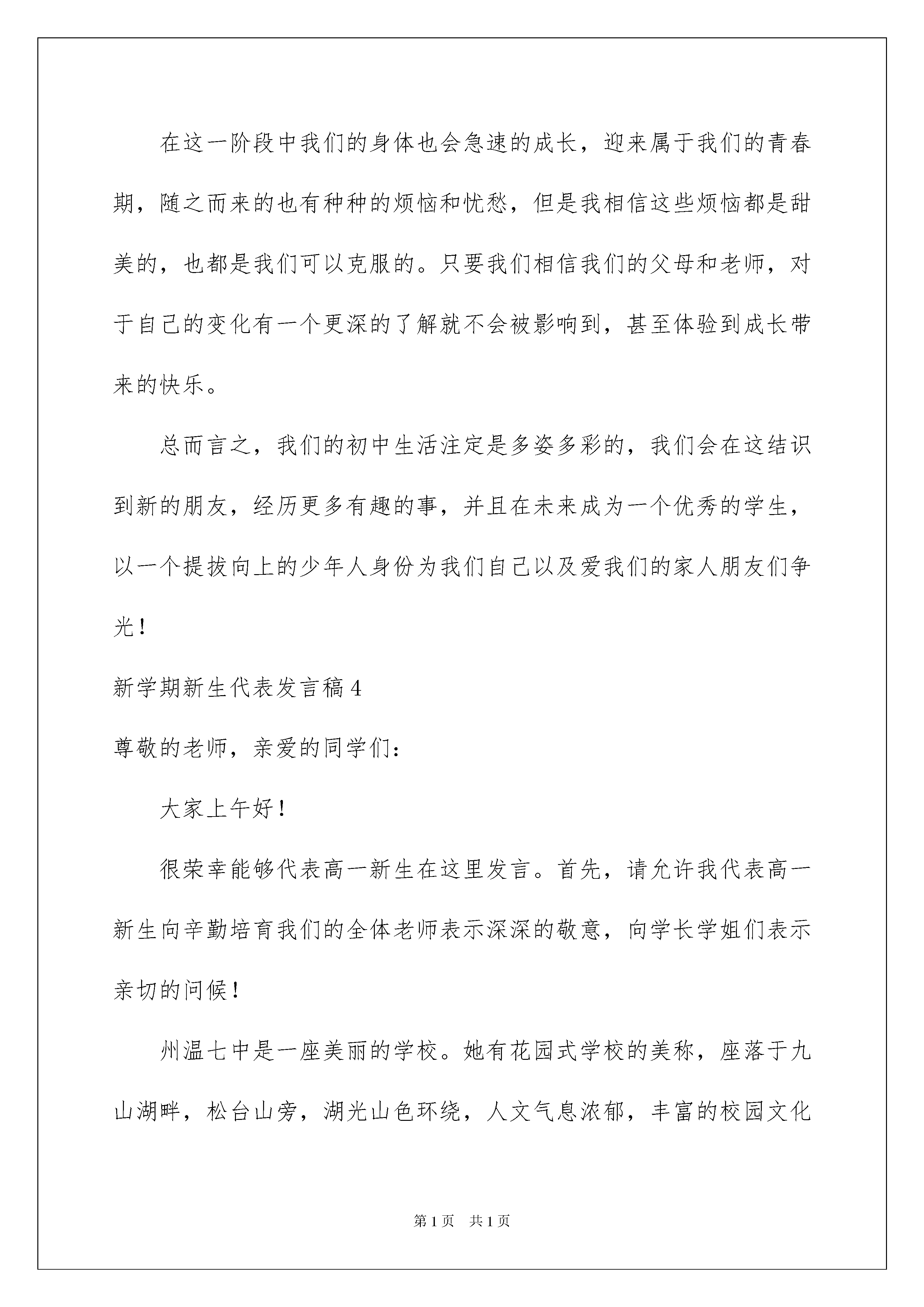 2022新学期新生代表发言稿新学期新生代表发言稿在快速变化和不断变革的新时代,需要使用发言稿的场合越来越多,发言稿可以帮助发言者更好的表达。写起发言稿来就毫无头绪?以下是我收集整理的新学期新生代表发言稿,仅供参考,欢迎大家阅读。新学期新生代表发言稿1各位尊敬的老师、同学们:大家好!我是xxxx班的xxx。尽管我已经在本校读了六年的书了,但是今天,当我站在初一新生的舞台上时,我仍是感慨万千,有着说不出的激动。我亲眼见证了杨园学校由落后的房屋、设备发展成现在的防震大楼和绿色化、科技化的校园。回首过去,红砖矮楼,木桌木椅,水泥操场,以及红漆木窗里传出的朗朗的读书声,都令我们永生难忘,而当我作为初中一年级的新生再次观看我的母校时,我被彻底的震撼了。校园散发出了一股浓烈的青春气息,仿佛也是“新生”的了。那门口的大型电子显示屏,写出了科技的先进,那一旁被百花拥簇着的大书本,读出了教育的灵魂,那红绸缎似的塑胶跑道,跑出了时代的进步,还有那神采奕奕的现代大楼,造出了代代的天骄。无论在校园的哪一个角落,你都能发现新的生命,包括那嫩绿的芽。然而同学们,你们是否注意了呢?那些平凡的,不被大家所注意却又天天陪在我们身边的身影。那便是培育我们、日夜为我们操劳的老师。“老师是辛勤的园丁”,这是家喻户晓、无人不认可的一句话。而当我步入初中的大门后,我更加坚信这句话了。那些刚刚见面的老师们就像父母一样关心着我们,小心翼翼地呵护着我们。那一个个信任的眼神,那一句句鼓励的话语,那一声声慈爱的嘱咐,无不体现着老师对我们的关怀。而老师却又让我们面对风雨,面对困难,学会独立,学会自主,自己也与我们一同前行,一同跨越障碍。跑操时,跟在后面气喘吁吁却不曾停下的脚步,那飘逸的青丝上又多出的一根白发,那温柔的眸子边由于日夜操心而留下的暗淡灰黑的眼圈?那是老师为我们的快乐、为我们的成长所奉献出的心血啊!一日为师,终生为父。老师,我们所有的新生都想对您说辛苦了。初来乍到的同学们,和我一样的同学们,我们是时候该抖擞精神,拼搏奋斗了!为了不枉父母的心血,师长的'操劳,学校的重望,我在此,代表全体新生向大家发誓:我们一定努力学习,积极进取,踏实勤奋,好好做人,争取将来成为国家的栋梁之才!新学期新生代表发言稿2尊敬的各位领导、老师,亲爱的同学们:你们好!首先请允许我代表全体同学,向高一的新同学们表示诚挚而热烈的欢迎!我今天发言的题目是《奋斗,没有句号!》今天能在这里讲话,我很荣幸,也很感慨。三年前,我和你们一样,怀着紧张和期待走进了高中部的校门。从初一到高三,从少年到青年,我在___中学度过了人生中最为重要的六年。初中的三年还算轻松,但开始进入高中学习时,我和多数人一样产生了紧张不安的情绪。然而当我走入校门,面前是优美的校园。她幽静美丽,绿树成荫,富有浓郁的学习氛围,我的心平静了下来。我知道,只要有梦,我就能在这里创造出一片属于自己的天空。高中这三年永远值得怀念,我的母校,我的老师是无私的,在我们前进的背后,有他们无私的付出。在这里,我遇到了最可爱的班级,遇到了志趣相投的同学,遇到了诲人不倦的老师,收获了一个崭新的自己。在老师、同学的帮助与陪伴下,我高中的学习经历犹如一条溪流,虽有曲折虽有起伏,却始终向前。在这里,学习不再是一个咀嚼痛苦的过程,而是一种享受。因为我们的老师们经验丰富,他们用成熟而富有实战性的技巧帮助我们少走了许多弯路。就这样,我们坚定地走在人生的征途上,每个人信心满满,风雨兼程。说起高中的学习,很多人认为,初中学习与高中学习截然不同。然而我并不这么认为,初中与高中其实大同小异。新学期新生代表发言稿3尊敬的xx:大家好!今天是一个晴朗的好天气,正像是我们晴朗的心情,就在今天,我们步入了新的学校,开启了我们人生中一段新的路程和新的挑战。而我也非常的幸运,能够在我们这么多的新生中作为代表来到这个讲台上进行发言。虽然我个人的能力可能不足以代表我们这一个优秀的新生集体,但是我也愿意用我的微薄之力向全校师生们宣布我们这一届学生的到来,也想要从我自己的角度来对我们这一整个新生集体进行宣誓和鼓励,让我们在初中这样一个新的环境里取得超过小学的成绩。毕竟我们曾经都是各个学校的优秀学生,现在来到了新的学校也是一样,但是初中毕竟跟小学时候不太一样,我们也多了很多需要注意的地方。最明显不过的就是我们的学习压力了,从小学的语文、英语、数学这三科升级到初中的七科,中间没有什么过度的时间,这无疑会让习惯了小学学习节奏的我们感到万分的不适应。而且上了中学以后,我们要开始进行晚自习了,不像小学那样下午上完课就可以放学回家,我们晚上依然要在教室里挑灯夜战