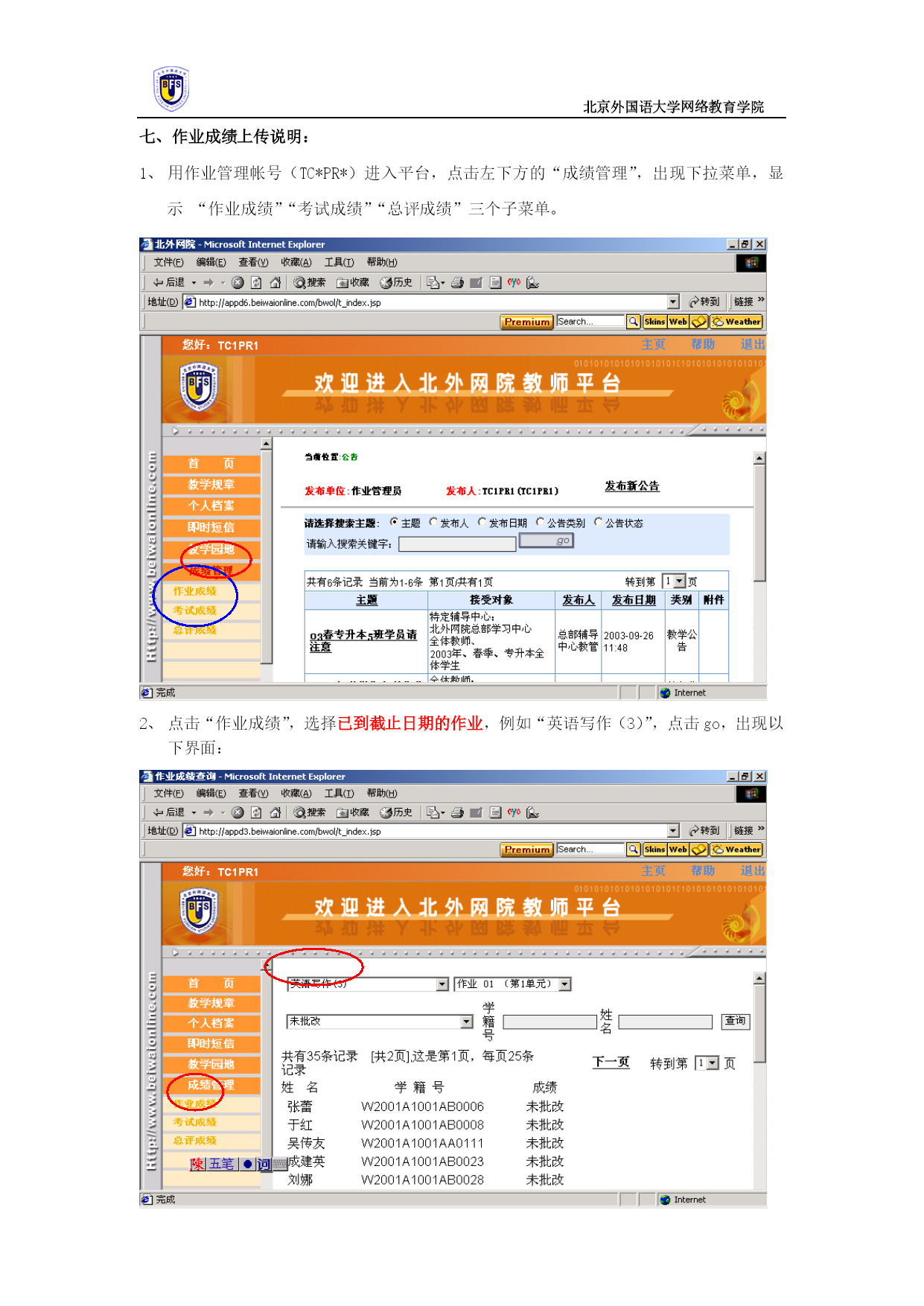 北京外国语大学网络教育学院作业管理规定文件名称北京外国语大学网络教育学院作业管理规定适用单位主要执行部门各学习中心教务涉及部门教学管理中心、测试中心版本号1.0版本定稿作者(修订者)测试中心完成时间2004年7月关键词作业管理、教务北外网院作业管理规定(2004年7月)为加强对学生作业的管理,明确学习中心和网院总部相关中心各方在作业提交、作业下载、评阅、成绩录入和成绩汇总各个环节中的责任,特制定《北外网院作业管理规定》。作业批改情况监控流程学生按时提交作业并确认是否提交成功提交作业(截止日前)学习中心下载