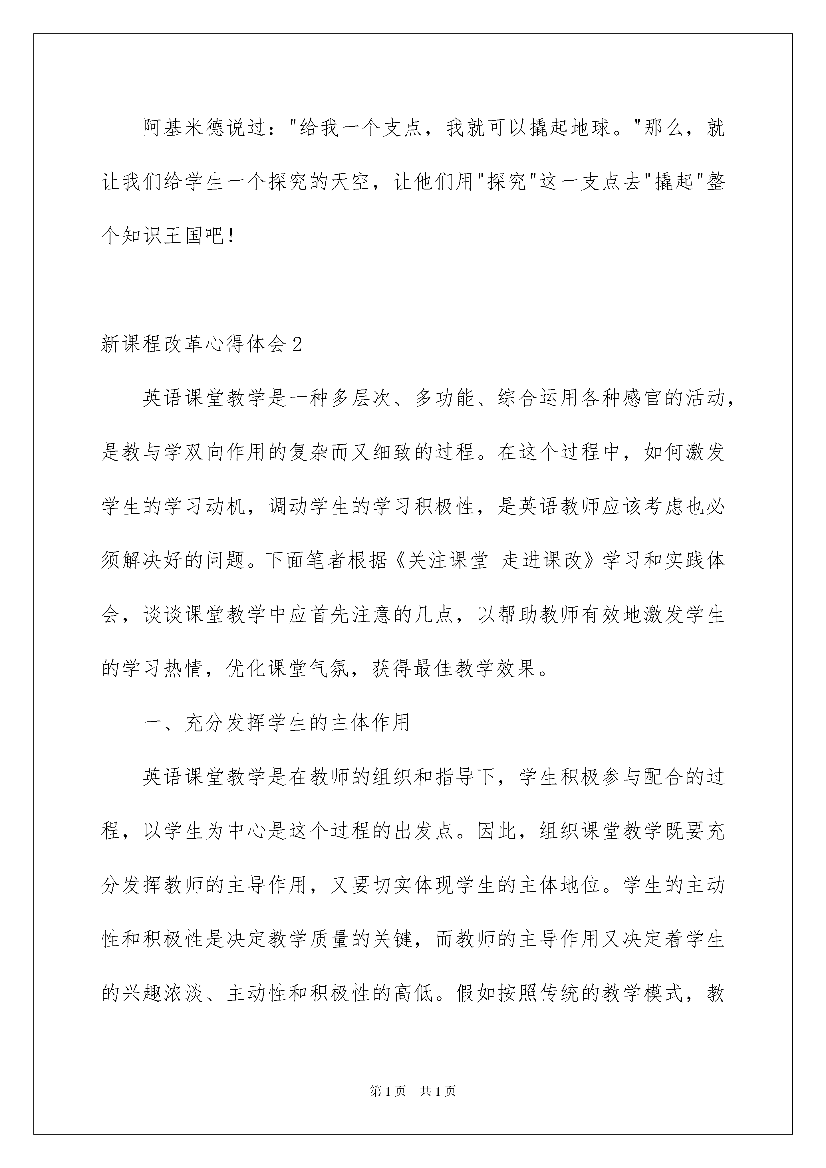 2022新课程改革心得体会新课程改革心得体会当我们受到启发,对生活有了新的感悟时,可以寻思将其写进心得体会中,这样能够培养人思考的习惯。那么问题来了,应该如何写心得体会呢?下面是我整理的新课程改革心得体会,欢迎阅读,希望大家能够喜欢。新课程改革心得体会1新课程理念的核心是"为了每一位学生的发展",我想这就是评价新课程课堂教学的惟一标准。通过教学实验,慢慢理出一点头绪,下面谈谈自己的一点体会:一、平等对话新课改改变了以往的教师滔滔不绝地讲,居高临下地问,学生规规矩矩地听,小心翼翼地学。当学生平等、互尊的情感得到满足时,才会轻松、愉快地投入学习,才会主动探究,因此,现代课堂教学应确立师生平等的教学观念,构建平等对话的教学平台,使教学"在师生平等的过程中进行"将师生关系"理解为愉快的合作,而不是意志间的冲突,对权威、尊严的威胁",让学生在率真、坦诚、互尊的环境里一起学习。这个过程不再是应该使学生处于一种心理放松、精力集中状态,思维活跃,敢想敢问,敢说敢做。1、给学生机会。比如在教学问题研究《煤城焦作出路何在》时,通过“竞选焦作市市长”的情景设计,使学生体会地理学对决策的贡献,培养学生学以致用的能力。通过这样的学习,不仅考查了学生收集的资料,培养了学生表达能力。而且变老师枯燥的讲解为学生自主地我想说,我能演。再通过读书,进一步了解煤城焦作。通过这一节课的教学,使师生、生生、生文对话达到融合,学生在轻松的氛围中学到了知识,学会了学习。发散学生思维。平等对话使学生在课堂上成为学习的主动者,把自己想说的,能说的都说出来,给学生展示自己的机会。2、虚心请教。教师不是万能之人。作为教师应该放下架子向学生学习。使学生明白,不管是谁都要学习,不管是谁,只要会就能成为别人的老师。给学生以自信,激发学生的学习欲望。3、合作学习。小组合作学习也是平等对话。老师参与学生的合作中。让每个学生都有机会说话。学会合作,增强自信。二、创设情境,发挥最佳效果。在教学实践中,试图从日常生活入手,创设生动有趣的问题情境,吸引学生的注意力,激发学生的学习兴趣,这样使学生从生活经验和客观事实出发,在研究现实问题的过程中学习地理、理解地理,同时把学习到的地理知识应用到生活实际,使学生亲近地理,感到学习地理的快乐,初步体现与现时生活的联系。三、奖励激励,提高学习积极性。在教学中,充分关注学生情感态度变化,采取积极的评价,较多地运用激励性的语言。如:说得真好!你懂得真不光少!你想象力非常丰富!真聪明等等!调动了学生积极探求知识的欲望,激发了学生学习的情感,让每个学生体验成功,增强自信心。课改:要能发挥学生主体性和积极性,有一个创新思维活动的空间,关键在于教师;教师如何引导,启发,点拔?能否真正地把学生引到这一领域?教师在平时备课中不但要吃透教材,而且要尽量地搜集,制作与教材有关的知识,教具;又要善于把握学生的心里,使学生能够与老师发生共鸣。地理学科与自然界紧密相联,和生活,生产密切相关。因此,在教学中教师要善于引导学生从熟悉的事物,现象出发,根据学生掌握的情况,创设情境提出问题,激励学生共同参与,发挥想象,积极思维来解决问题的意向。面对新课程,教师应确定更高层次的教学目标。对于教学课而言,不能光是知识的传授,而是包括知识与技能、思考、解决问题、情感与态度等几个方面。那种追求“能够教好一节课”或“教出了几个能考高分的学生”为目的的教学已经不符合课改精神了。教会学生知识,教给学生方法,教给学生独立和生存的能力应成为所有教师的职业追求。学生应成为课堂学习的主人环顾周围,在我们的教学中还存在许多这样的现象:一些学生在生活中早已熟悉的东西,教师还在不厌其烦地从头讲起;一些具有较高综合性和较高思维价值的问题,教师却将知识点分化,忽视了学生自主探究和知识的综合运用能力的培养;一些本该让学生自己去动手操作、试验、讨论、归纳、总结的内容却被老师取而代之;一些学生经过自己的深思熟虑形成的独特见解和疑问,往往因为老师的“就照我教的来”而扼杀。在新课程下,教师应当成为学生学习的组织者、引导者和合作者,激发学生的学习积极性、创造性,为学生提供从事活动的机会,构建开展研究的平台,让学生成为学习的主人。灵活使用挖掘教材有许多教师不适应新教材,不知道把教材与实际联系起来。实际上,教师在教学过程中应根据学生的认知规律和现有水平,在认真领会教材编写意图的同时,学会灵活、能动地运用教材,根据学生实际进行必要的增删、调整,这样才能从“有限”的教材中无限延伸。追求形式和效果统一的课堂现在,一些课堂滥用讨论、合作学习的方式,不给学生足够的机会和科学的指导,使课堂流于形