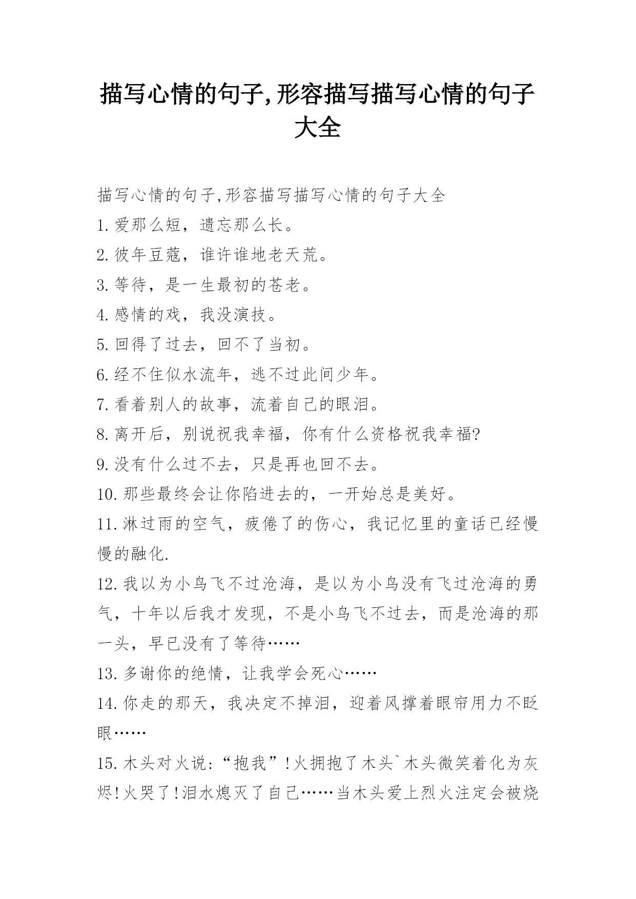 描写心情的句子,形容描写描写心情的句子大全描写心情的句子,形容描写描写心情的句子大全1.爱那么短,遗忘那么长。2.彼年豆蔻,谁许谁地老天荒。3.等待,是一生最初的苍老。4.感情的戏,我没演技。5.回得了过去,回不了当初。6.经不住似水流年,逃不过此间少年。7.看着别人的故事,流着自己的眼泪。8.离开后,别说祝我幸福,你有什么资格祝我幸福?9.没有什么过不去,只是再也回不去。10.那些最终会让你陷进去的,一开始总是美好。11.淋过雨的空气,疲倦了的伤心,我记忆里的童话已经慢慢的融化.12.我以为小鸟飞不过沧