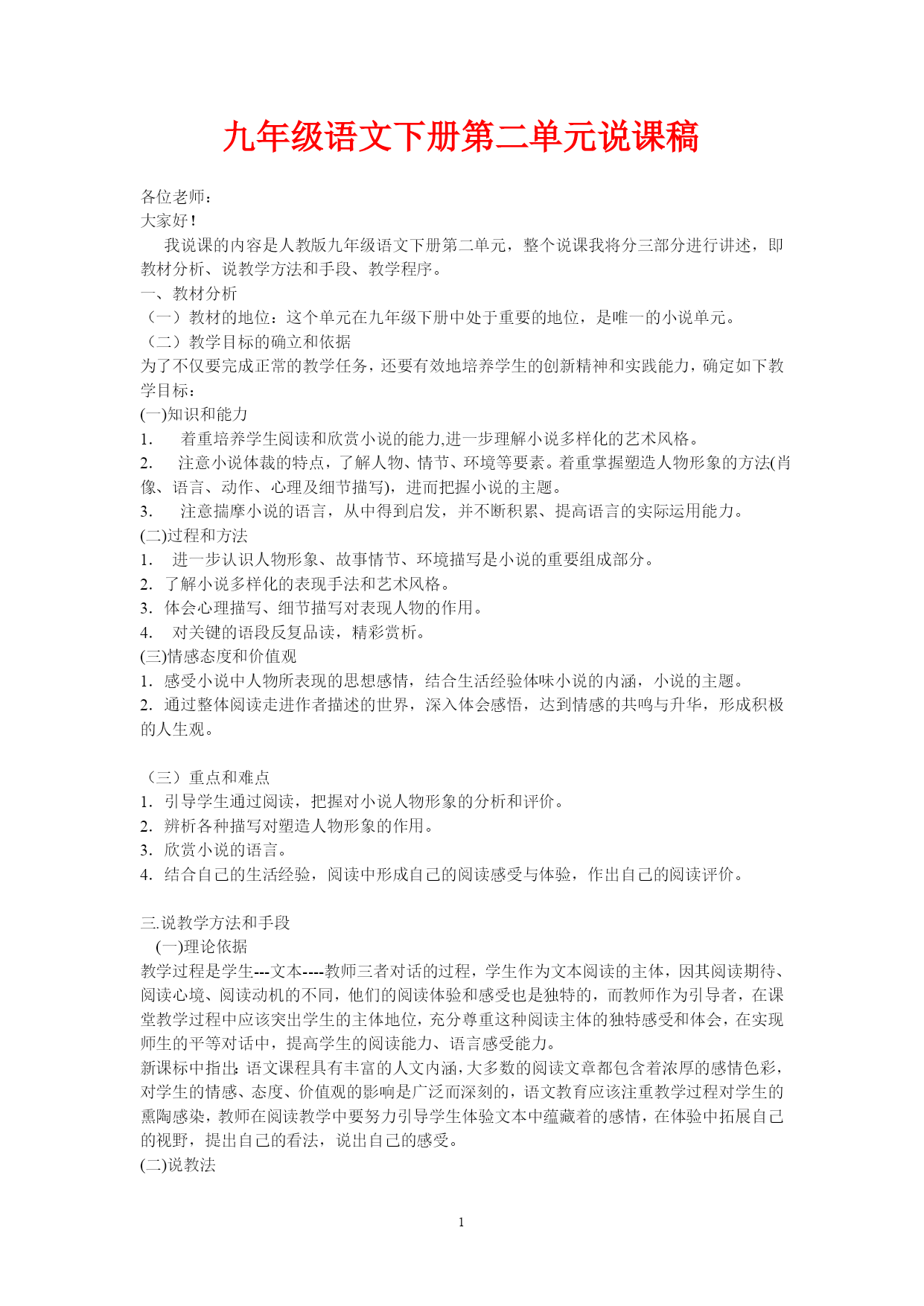 九年级语文下册第二单元说课稿各位老师:大家好!我说课的内容是人教版九年级语文下册第二单元,整个说课我将分三部分进行讲述,即教材分析、说教学方法和手段、教学程序。一、教材分析(一)教材的地位:这个单元在九年级下册中处于重要的地位,是唯一的小说单元。(二)教学目标的确立和依据为了不仅要完成正常的教学任务,还要有效地培养学生的创新精神和实践能力,确定如下教学目标:(一)知识和能力1.着重培养学生阅读和欣赏小说的能力,进一步理解小说多样化的艺术风格。2.注意小说体裁的特点,了解人物、