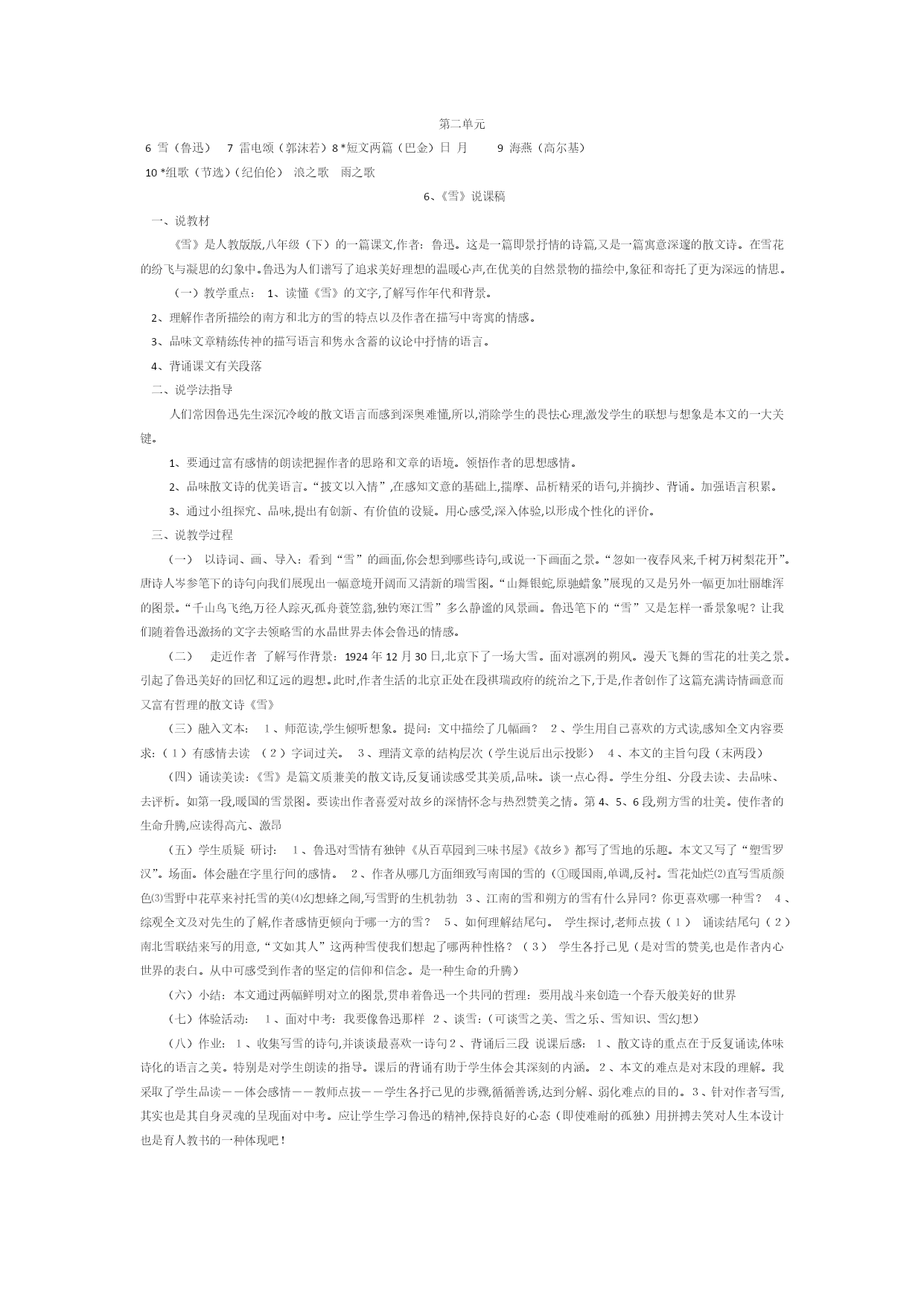 第二单元6雪(鲁迅)7雷电颂(郭沫若)8*短文两篇(巴金)日月9海燕(高尔基)10*组歌(节选)(纪伯伦)浪之歌雨之歌6、《雪》说课稿一、说教材《雪》是人教版版,八年级(下)的一篇课文,作者:鲁迅。这是一篇即景抒情的诗篇,又是一篇寓意深邃的散文诗。在雪花的纷飞与凝思的幻象中。鲁迅为人们谱写了追求美好理想的温暖心声,在优美的自然景物的描绘中,象征和寄托了更为深远的情思。(一)教学重点:1、读懂《雪》的文字,了解写作年代和背景。2、理解作者所描绘的南方和北方的雪的特点以及作者在描写中寄寓的情感。3、品味文章精