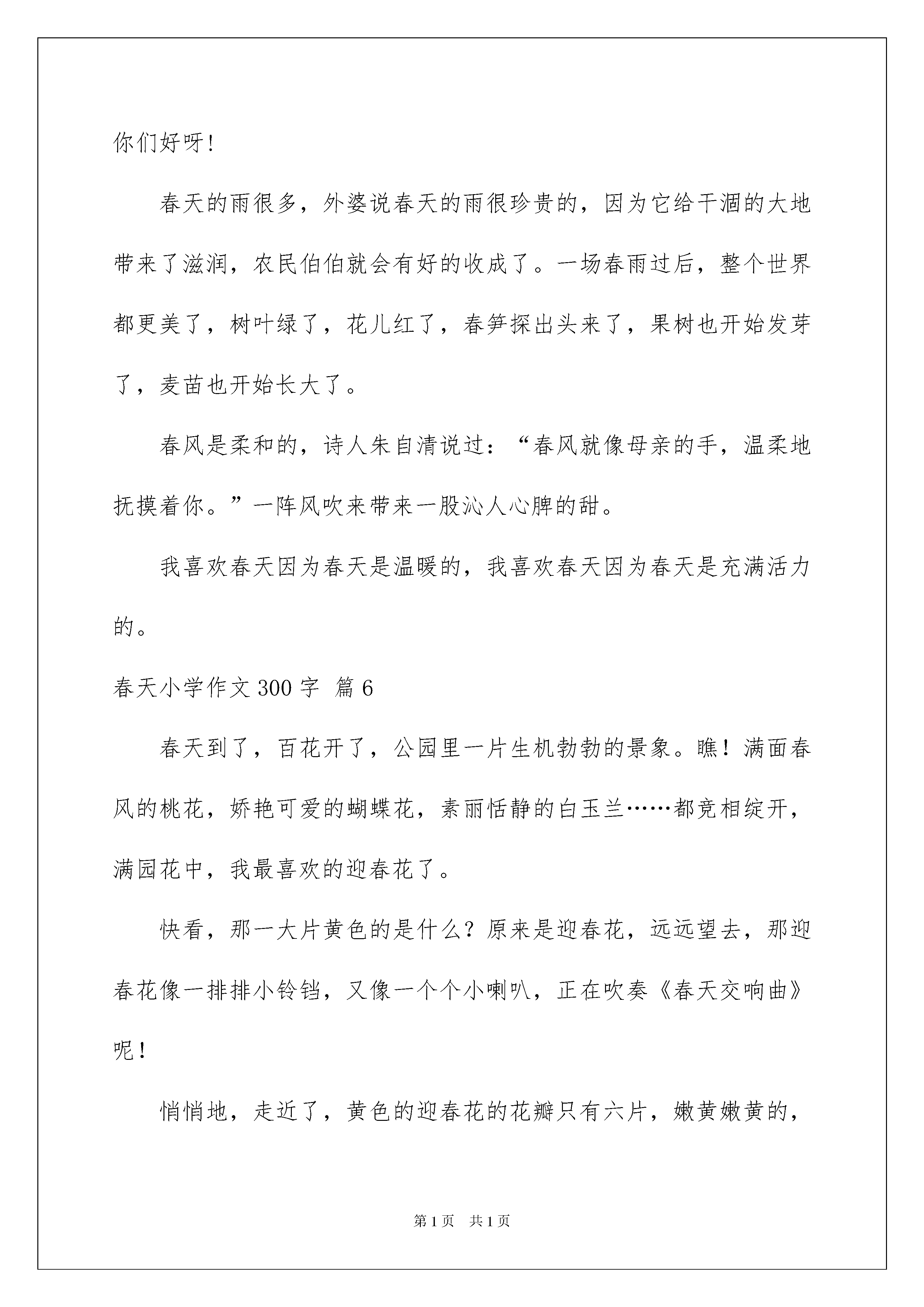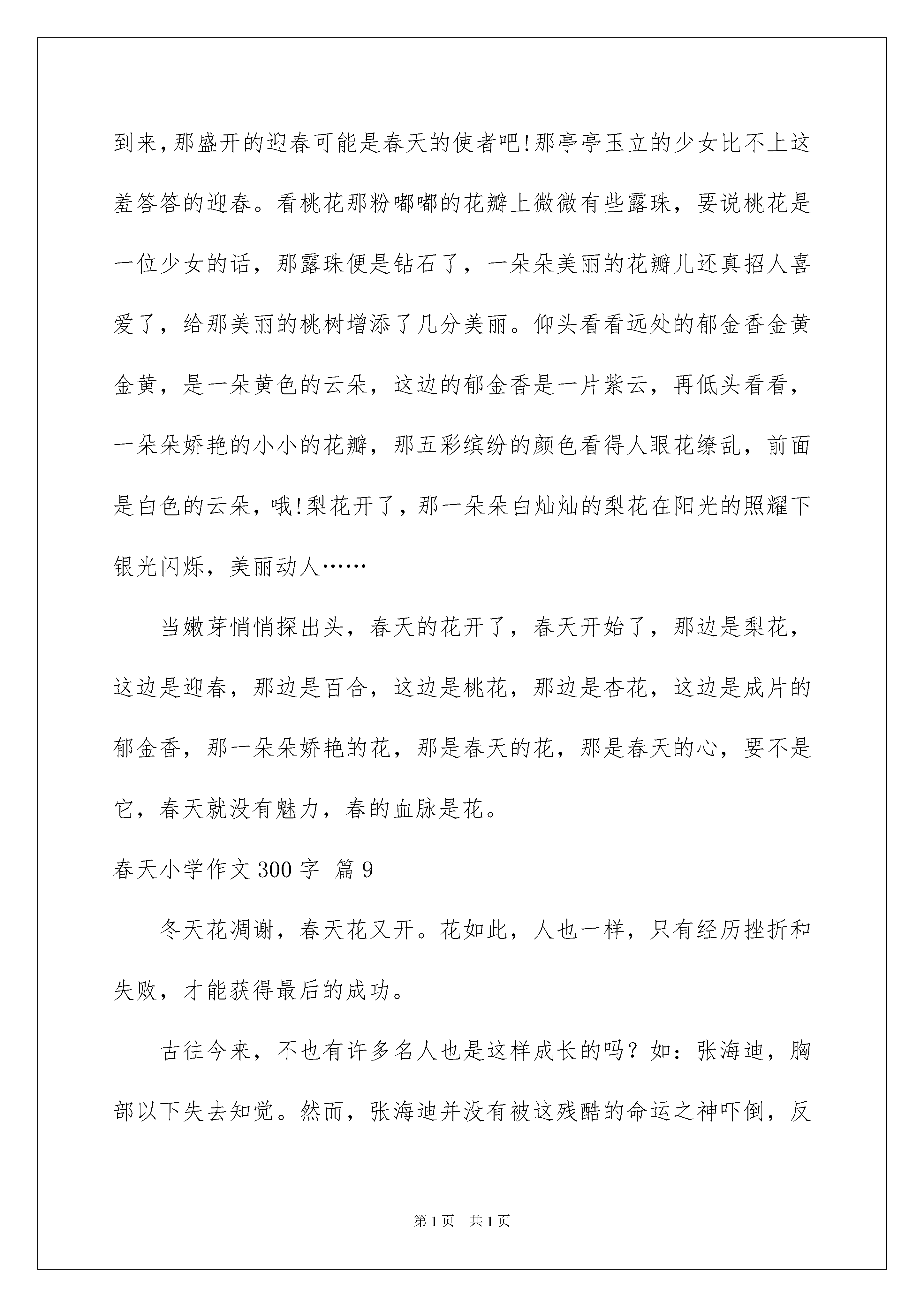 2022春天小学作文300字合集8篇春天小学作文300字合集8篇在平平淡淡的日常中,大家都接触过作文吧,借助作文可以提高我们的语言组织能力。你写作文时总是无从下笔?以下是我收集整理的春天小学作文300字8篇,仅供参考,希望能够帮助到大家。春天小学作文300字篇1冬天花凋谢,春天花又开。花如此,人也一样,只有经历挫折和失败,才能获得最后的成功。古往今来