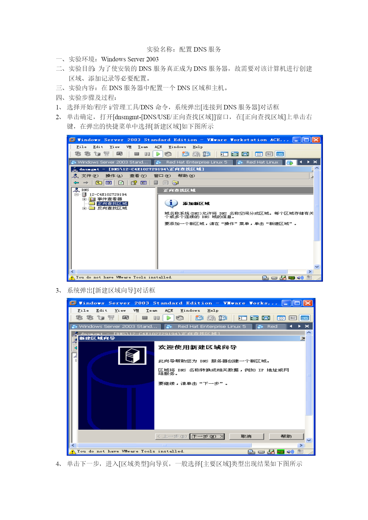 实验名称:配置DNS服务实验环境:WindowsServer2003实验目的:为了使安装的DNS服务真正成为DNS服务器,故需要对该计算机进行创建区域、添加记录等必要配置。实验内容:在DNS服务器中配置一个DNS区域和主机。实验步骤及过程:选择开始/程序i/管理工具/DNS命令,系统弹出[连接到DNS服务器]对话框单击确定,打开[dnsmgmt-[DNS/USE/正向查找区域]]窗口,在[正向查找区域]上单击右键,在弹出的快捷菜单中选择[新建区域]如下图所示系统弹出[新建区域向导]对话框单击下一步,进入[