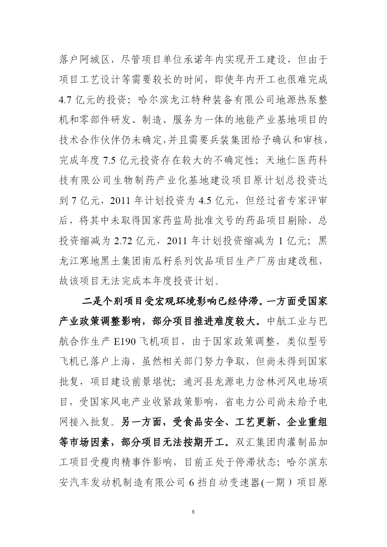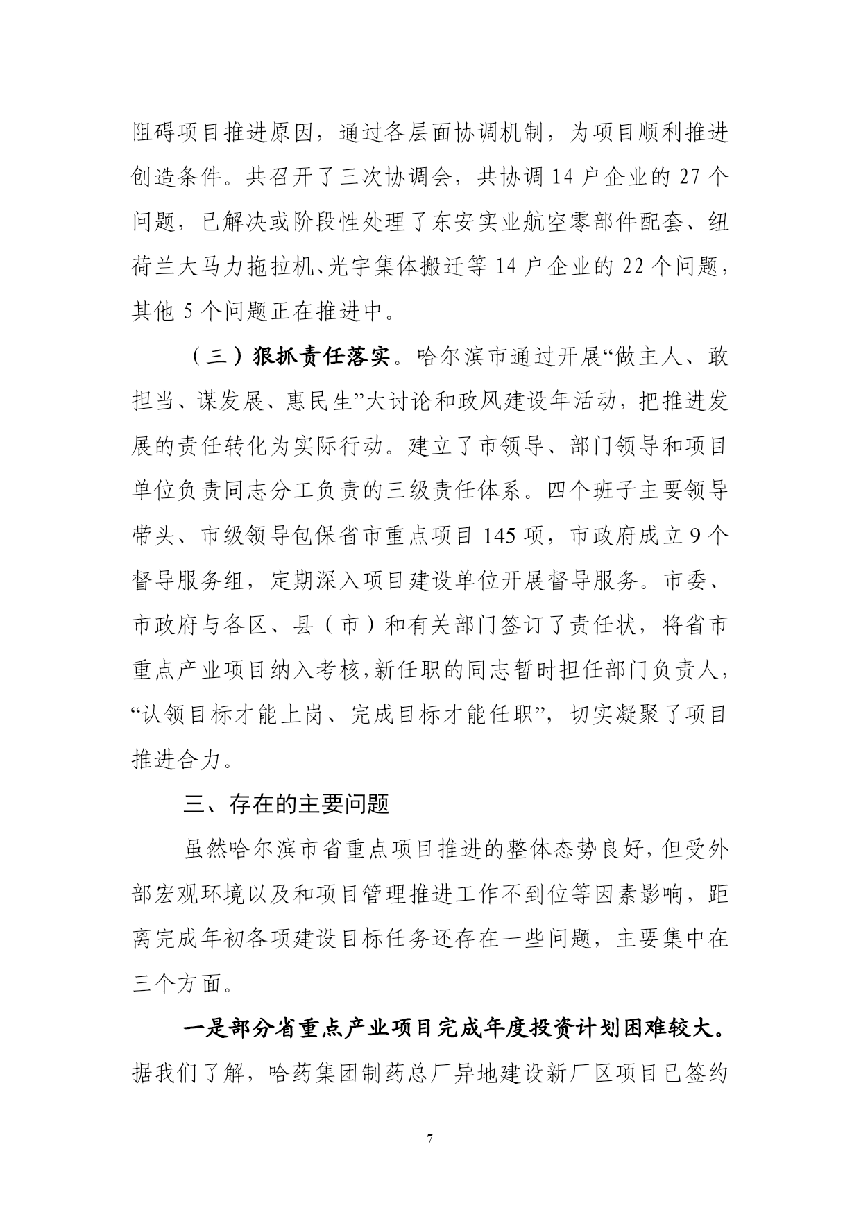 关于哈尔滨市重点产业项目建设联合督导工作情况的汇报第一督导组(2011年7月15日)按照省委、省政府关于产业项目建设年的总体部署和《关于对各市(地)重点产业项目建设开展联合督导工作的通知》要求,由省工信委、发改委、财政厅、环保厅、国土厅、金融办、电力公司组成的第一督导组,于7月12日至14日,赴哈尔滨市就产业项目建设进行了联合督导,现将有关情况报告如下:一、产业项目总体情况(一)省重点产业项目建设进展情况年初以来,哈尔滨市围绕贯彻落实省“产业项目三年决战”的总体要求,开展了