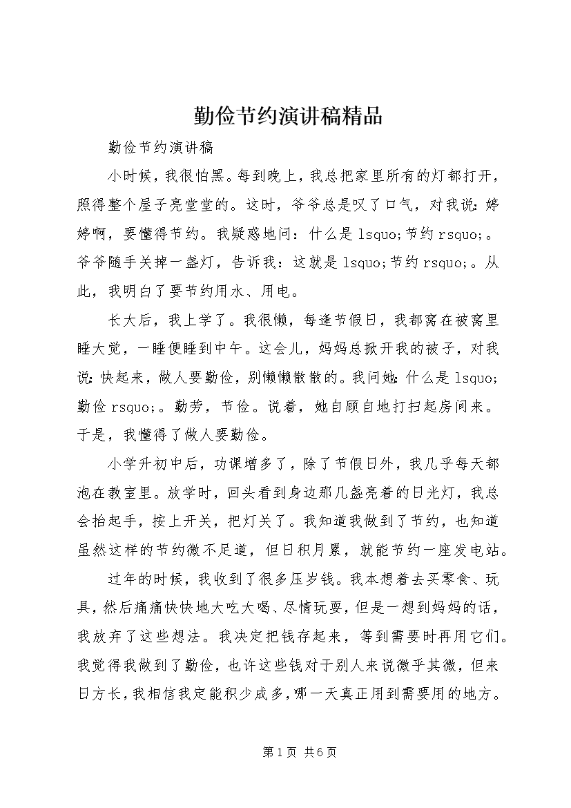 第PAGE\*Arabic\*MERGEFORMAT6页共NUMPAGES\*MERGEFORMAT6页勤俭节约演讲稿精品勤俭节约演讲稿小时候,我很怕黑。每到晚上,我总把家里所有的灯都打开,照得整个屋子亮堂堂的。这时,爷爷总是叹了口气,对我说:婷婷啊,要懂得节约。我疑惑地问:什么是lsquo;节约rsquo;。爷爷随手关掉一盏灯,告诉我:这就是lsquo;节约rsquo;。从此,我明白了要节约用水、用电。长大后,我上学了。我很懒,每逢节假日,我都窝在被窝里睡大觉,一睡便睡到中午。这会儿,妈妈总