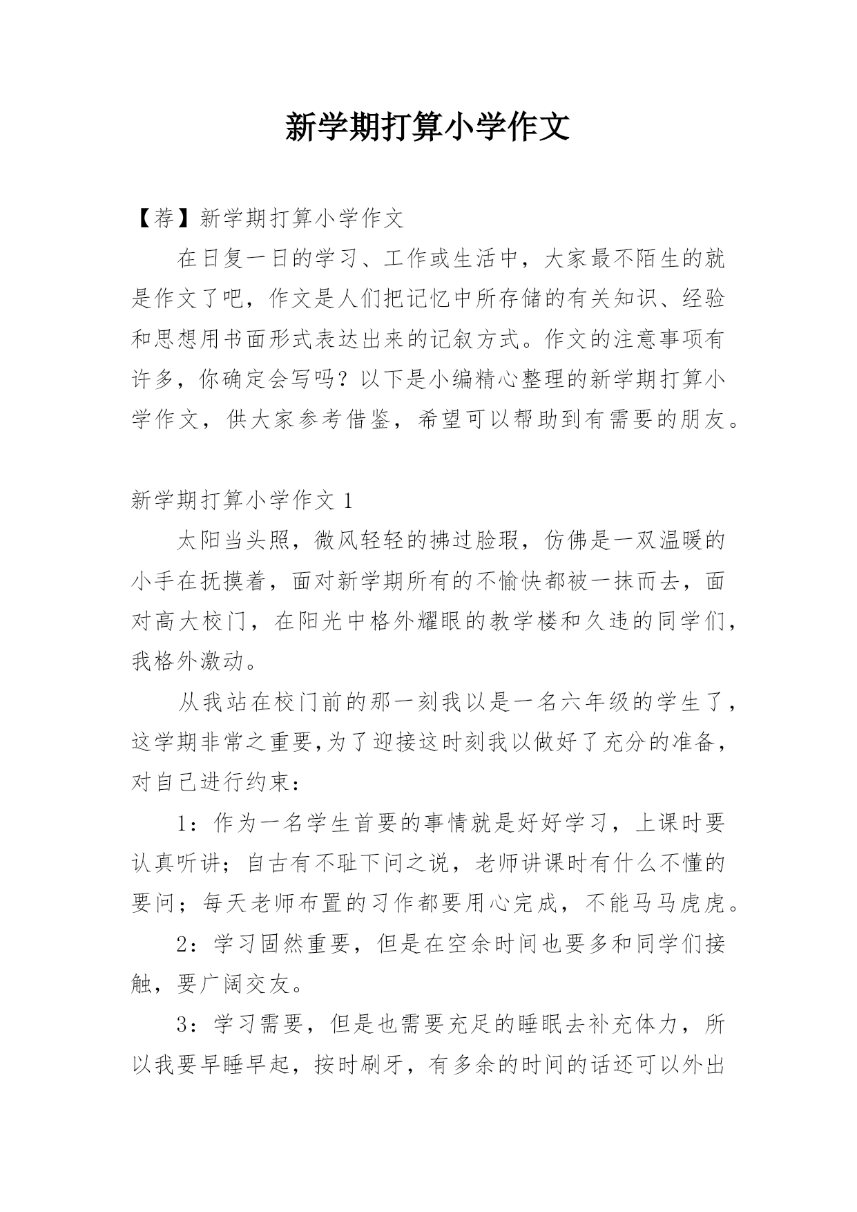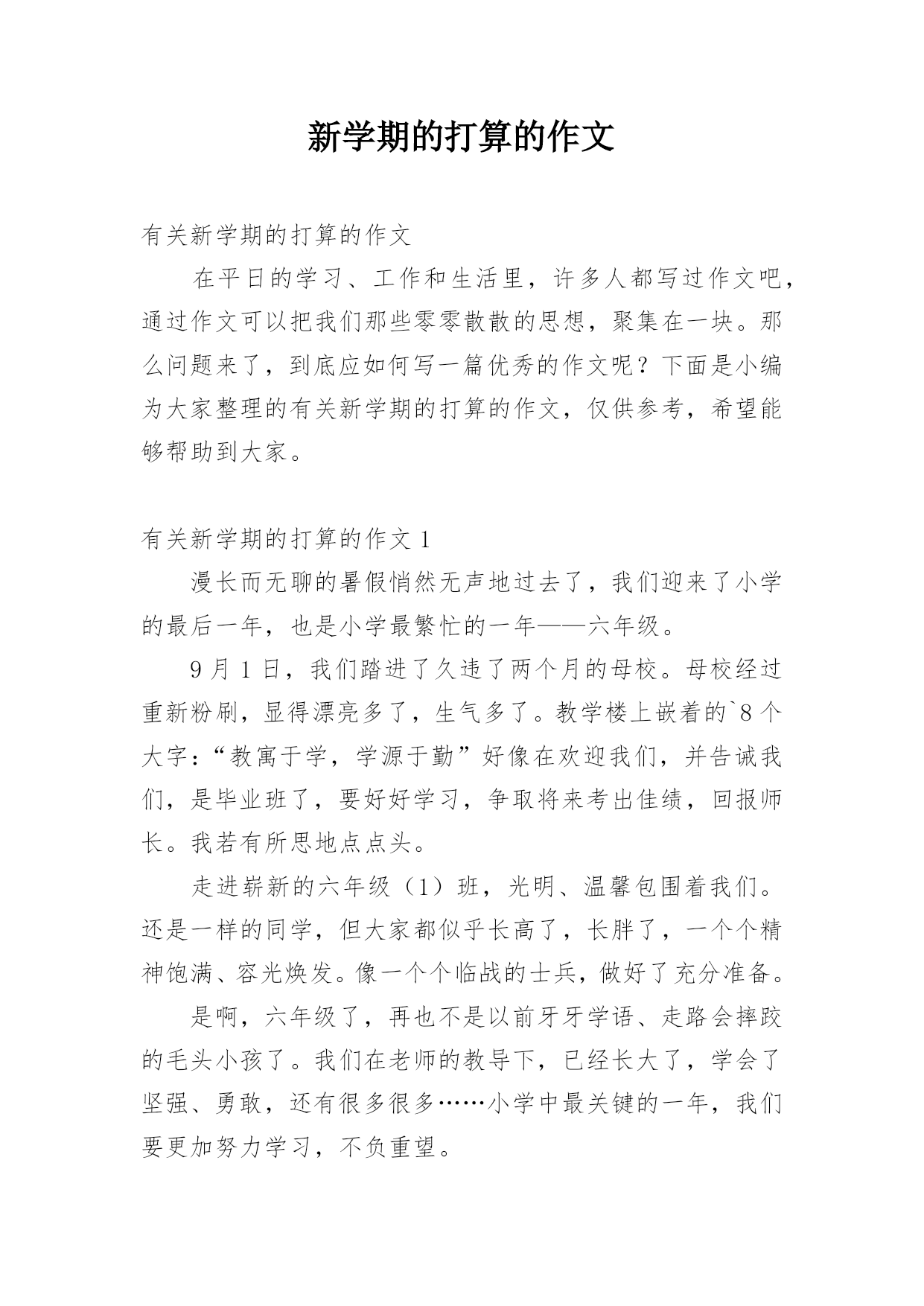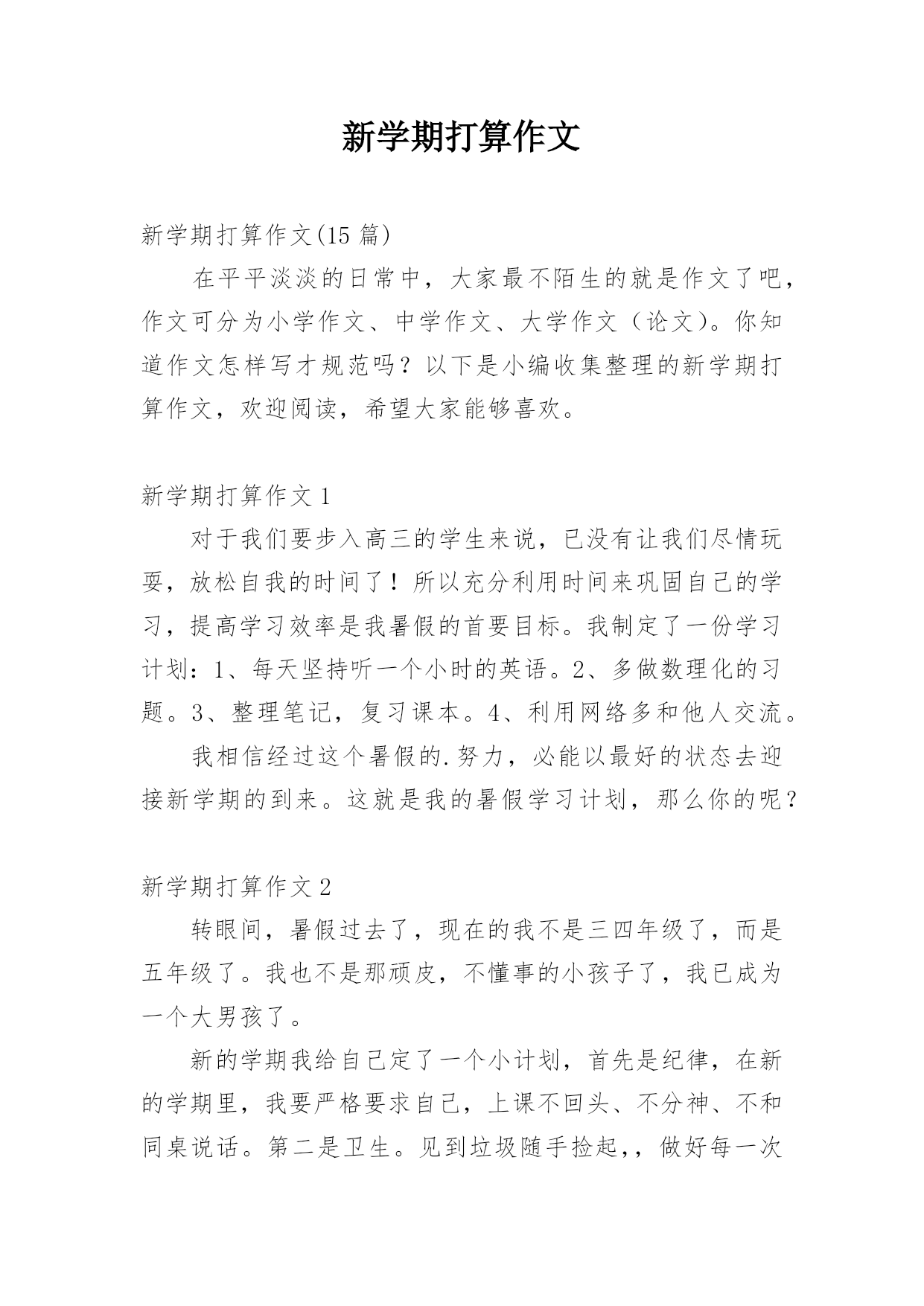 新学期打算作文新学期打算作文(15篇)在平平淡淡的日常中,大家最不陌生的就是作文了吧,作文可分为小学作文、中学作文、大学作文(论文)。你知道作文怎样写才规范吗?以下是小编收集整理的新学期打算作文,欢迎阅读,希望大家能够喜欢。新学期打算作文1对于我们要步入高三的学生来说,已没有让我们尽情玩耍,放松自我的时间了!所以充分利用时间来巩固自己的学习,提高学习效率是我暑假的首要目标。我制定了一份学习计划:1、每天坚持听一个小时的英语。2、多做数理化的习题。3、整理笔记,复习课本。4、利用网络多和他人交流。我相信经过