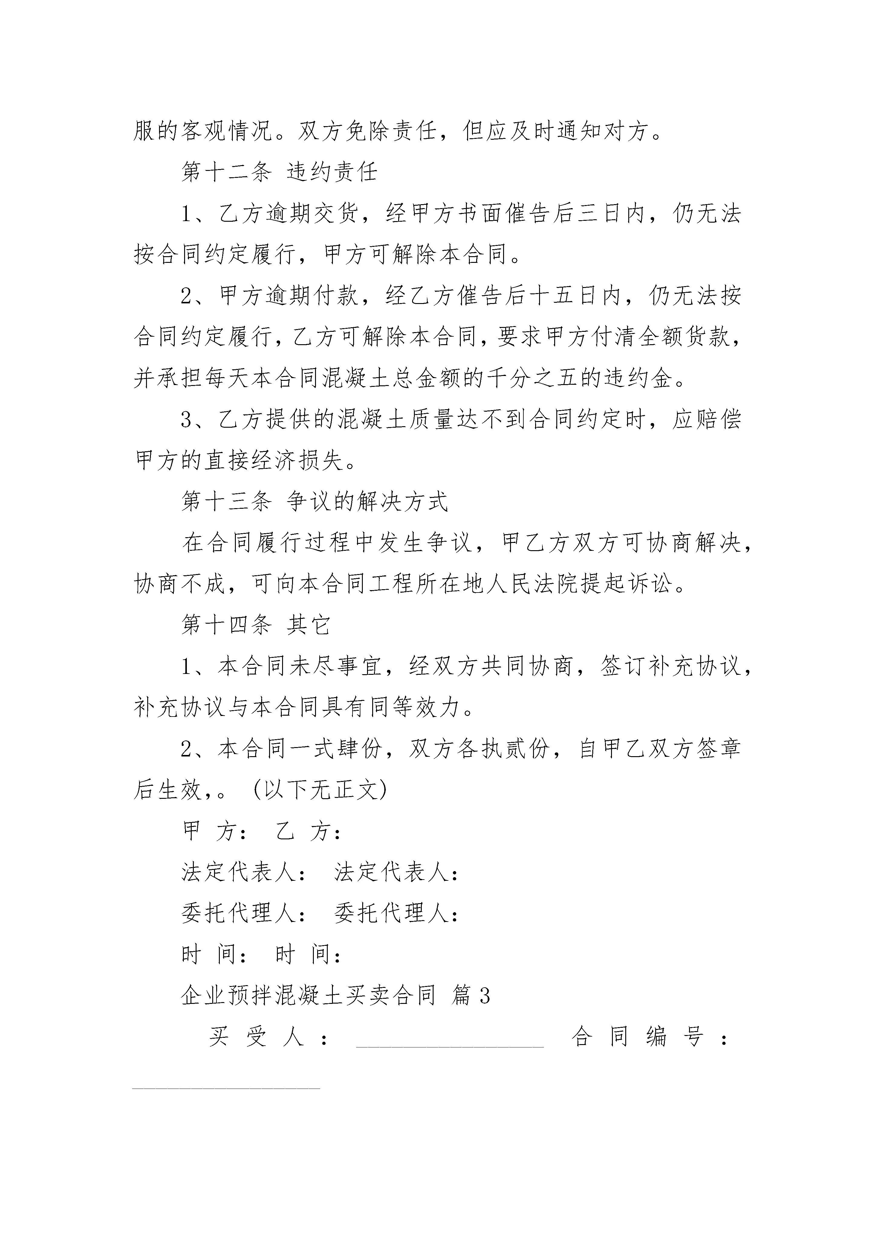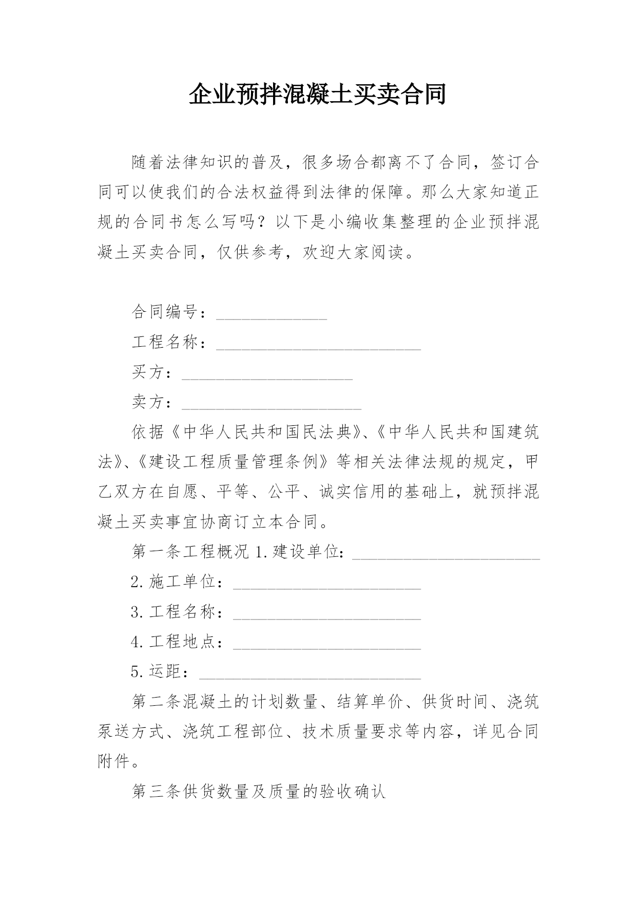 企业预拌混凝土买卖合同随着法律知识的普及,很多场合都离不了合同,签订合同可以使我们的合法权益得到法律的保障。那么大家知道正规的合同书怎么写吗?以下是小编收集整理的企业预拌混凝土买卖合同,仅供参考,欢迎大家阅读。合同编号:_____________工程名称:________________________买方:____________________卖方:_____________________依据《中华人民共和国民法典》、《中华人民共和国建筑法》、《建设工程质量管理条例》等相关法律法规的规定,甲乙双方在