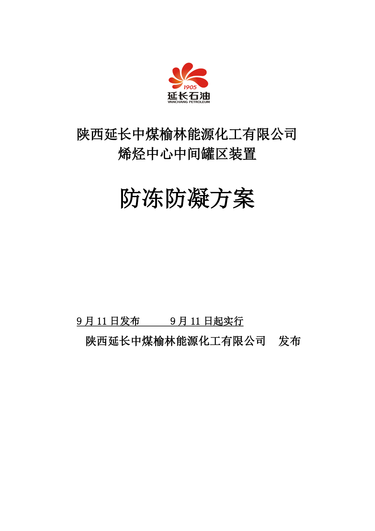 陕西延长中煤榆林能源化工有限公司烯烃中心中间罐区装置防冻防凝方案9月11日发布9月11日起实行陕西延长中煤榆林能源化工有限公司发布陕西延长中煤榆林能源化工有限公司烯烃中心中间罐区装置防冻防凝方案版本修订状态编制审核批准A0主编部门:烯烃中心中间罐区发布日期:月日原则名称:中间罐区装置防冻防凝方案目录TOC\o"1-3"\h\z\uHYPERLINK\l"_Toc"第一章总则PAGEREF_Toc\h3HYPERLINK\l"_Toc"1目PAGEREF_Toc\h3HYPER