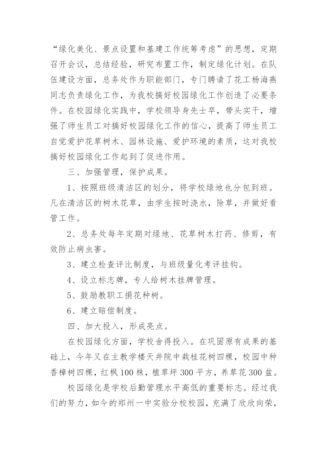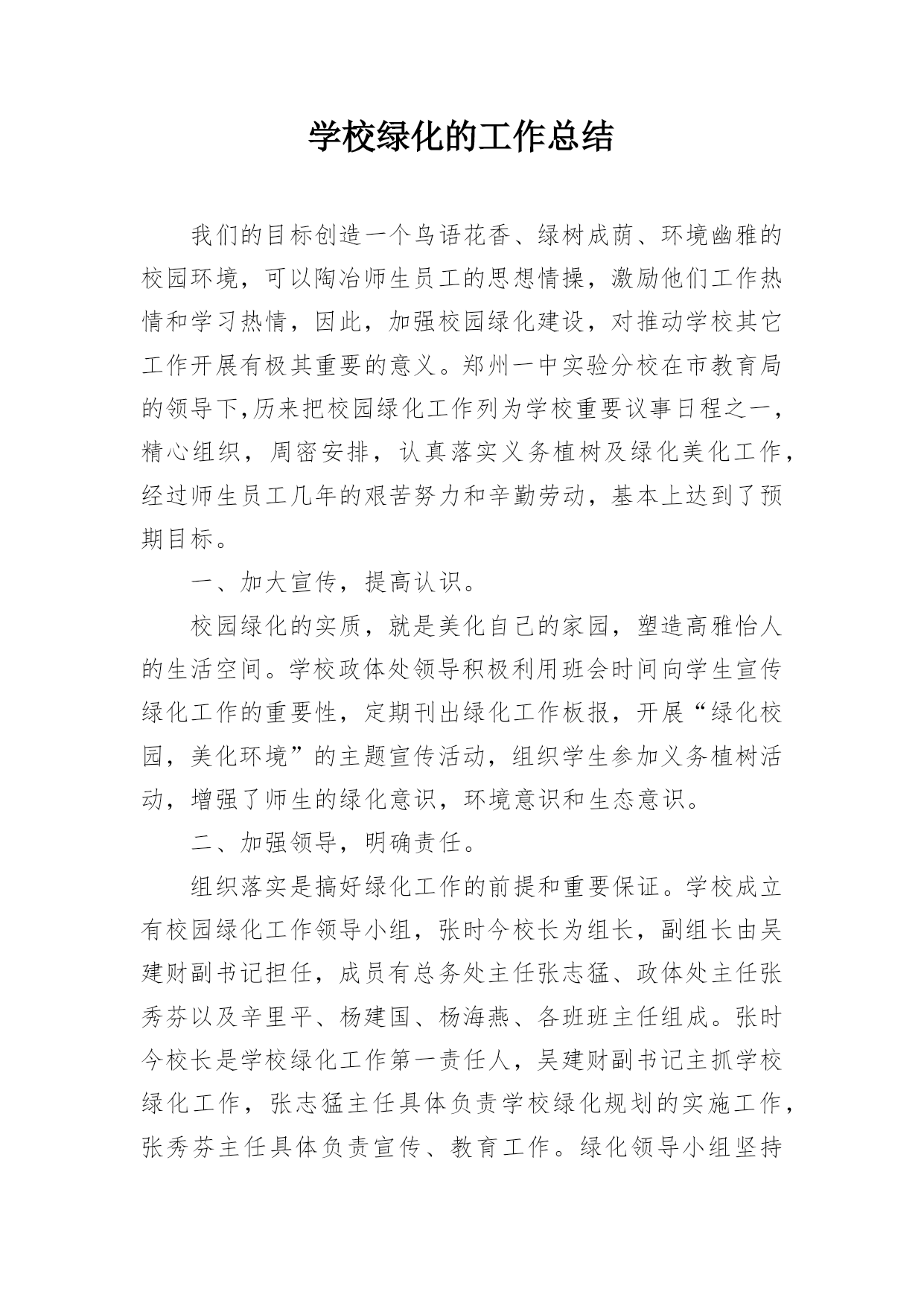 学校绿化的工作总结我们的目标创造一个鸟语花香、绿树成荫、环境幽雅的校园环境,可以陶冶师生员工的思想情操,激励他们工作热情和学习热情,因此,加强校园绿化建设,对推动学校其它工作开展有极其重要的意义。郑州一中实验分校在市教育局的领导下,历来把校园绿化工作列为学校重要议事日程之一,精心组织,周密安排,认真落实义务植树及绿化美化工作,经过师生员工几年的艰苦努力和辛勤劳动,基本上达到了预期目标。一、加大宣传,提高认识。校园绿化的实质,就是美化自己的家园,塑造高雅怡人的生活空间。学校政体处领导积极利用班会时间向学生宣