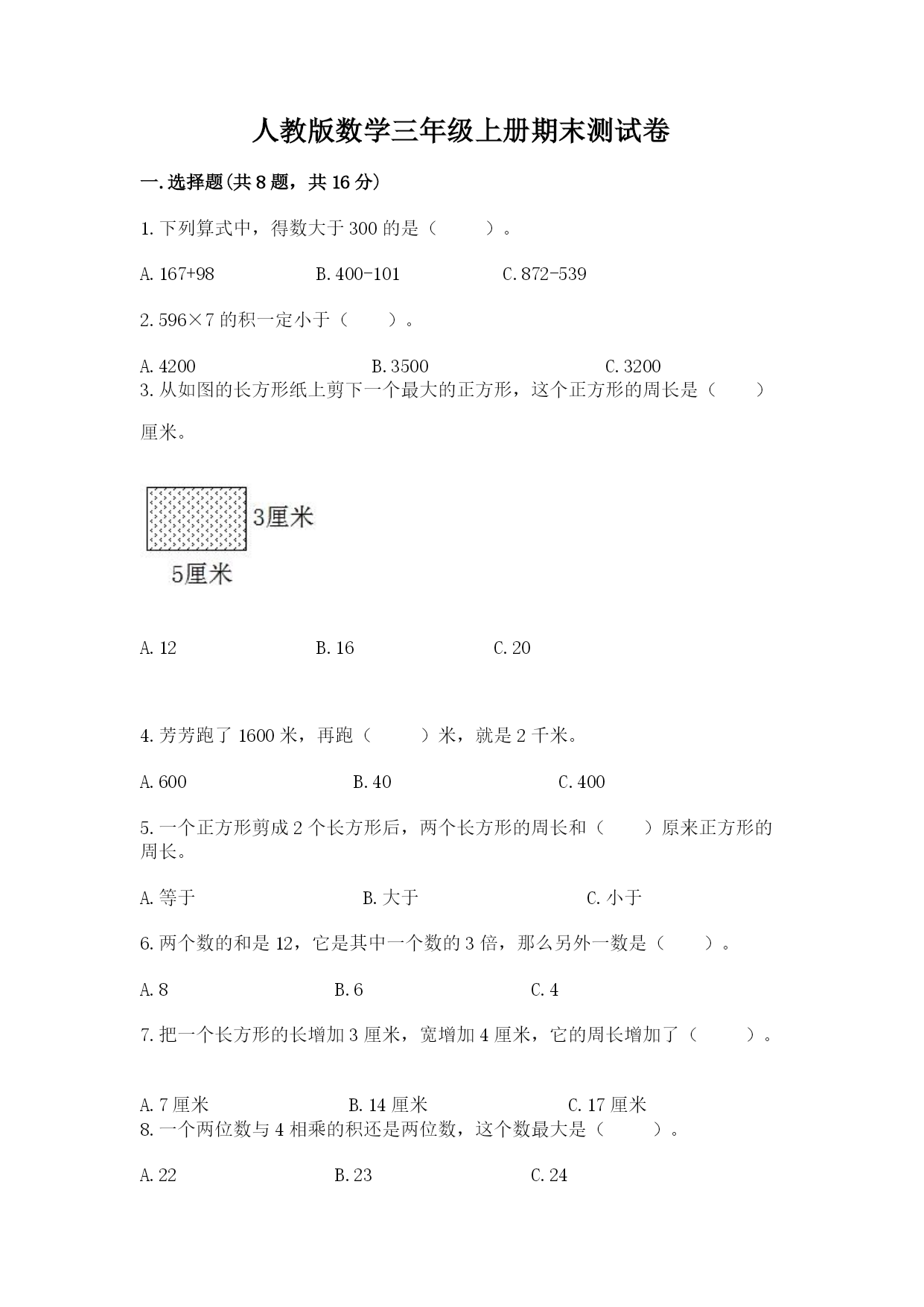 人教版数学三年级上册期末测试卷一.选择题(共8题,共16分)1.下列算式中,得数大于300的是()。A.167+98B.400-101C.872-5392.596×7的积一定小于()。A.4200B.3500C.32003.从如图的长方形纸上剪下一个最大的正方形,这个正方形的周长是()厘米。A.12B.16C.204.芳芳跑了1600米,再跑()米,就是2千米。A.600B.40C.4005.一个正方形剪成2个长方形后,两个长方形的周长和()原来正方形的周长。A.等于B.大于C.小于6.两个数的和是12,