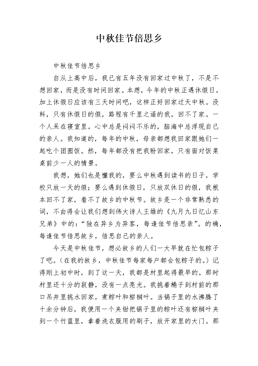 中秋佳节倍思乡中秋佳节倍思乡自从上高中后,我已有五年没有回家过中秋了,不是不想回家,而是没有时间回家。本想,今年的中秋正遇休假日,加上休假日应该有三天时间吧,这样正好回家过天中秋。没料,只有休假日的假,路程有千里之遥的我,回不了家。一个人呆在寝室里,心中总是闷闷不乐的,脑海中总浮现自己的亲人。我知道的,每年的中秋,母亲都想我回家跟她们一起吃个团圆饭。然,每年都没有把我盼回家,只有面对饭菜桌前少一人的情景。我想,她们也是懂我的,要么中秋遇到读书的日子,学校只放一天的假;要么遇到休假日,只放双休日的假,我根本