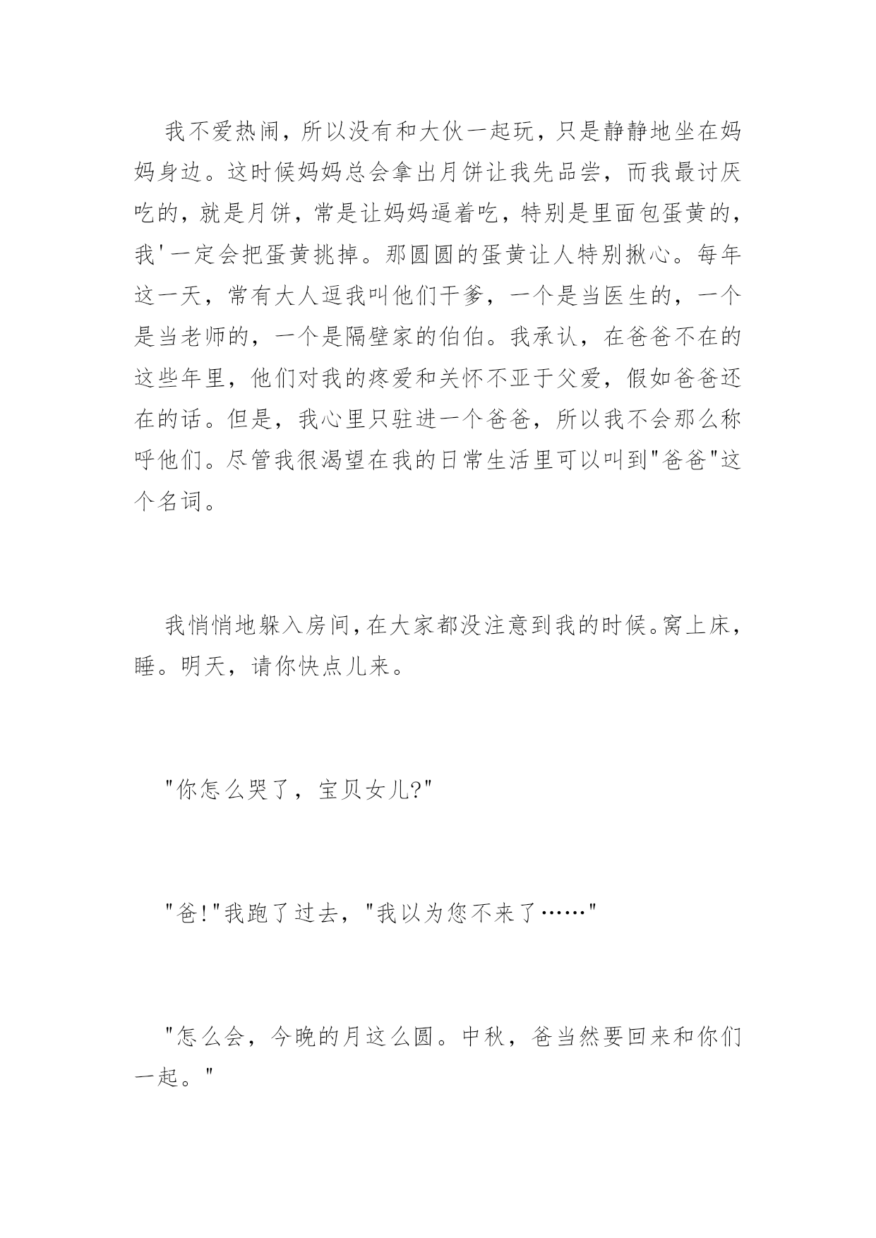 思乡的作文:倍思乡有关思乡的作文:倍思乡人言月圆中秋。到了中秋,月可是真的圆?近乎圆,却不圆。不然,就不会有不圆满的家。中秋,一个让我的心沉甸甸的词。临近中秋,就常有同学问我,你爸爸妈妈都回家了吗?我轻轻点头,笑了。也许笑得有点凄苦。她们都不知道,我爸爸早就不在,谈何回家。妈妈在这一天,总会把事务办得体体面面的,买大盒大盒的精装月饼,买各种名产水果,特色饼干,糖果,饮料,有的是送朋友,送亲戚,有的则是留着自家用。这天晚餐后,她会教我和哥哥诚心诚意地拜月亮。接着捧出当地最好的烟花,招来邻里的小孩子,把烟花一