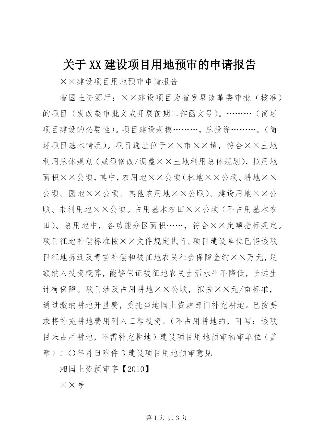 关于XX建设项目用地预审的申请报告××建设项目用地预审申请报告省国土资源厅:××建设项目为省发展改革委审批(核准)的项目(发改委审批文或开展前期工作函文号)。………(简述项目建设的必要性)。项目建设规模………总投资………。(简述项目基本情况)。项目选址位于××市××镇符合××土地利用总体规划(或须修改/调整××土地利用总体规划)拟用地面积××公顷其中农用地××公顷(林地××公顷、耕地××公顷、园地××公顷、其他农用地××公顷)、建设用地××公顷、未利用地××公顷。占用基本农