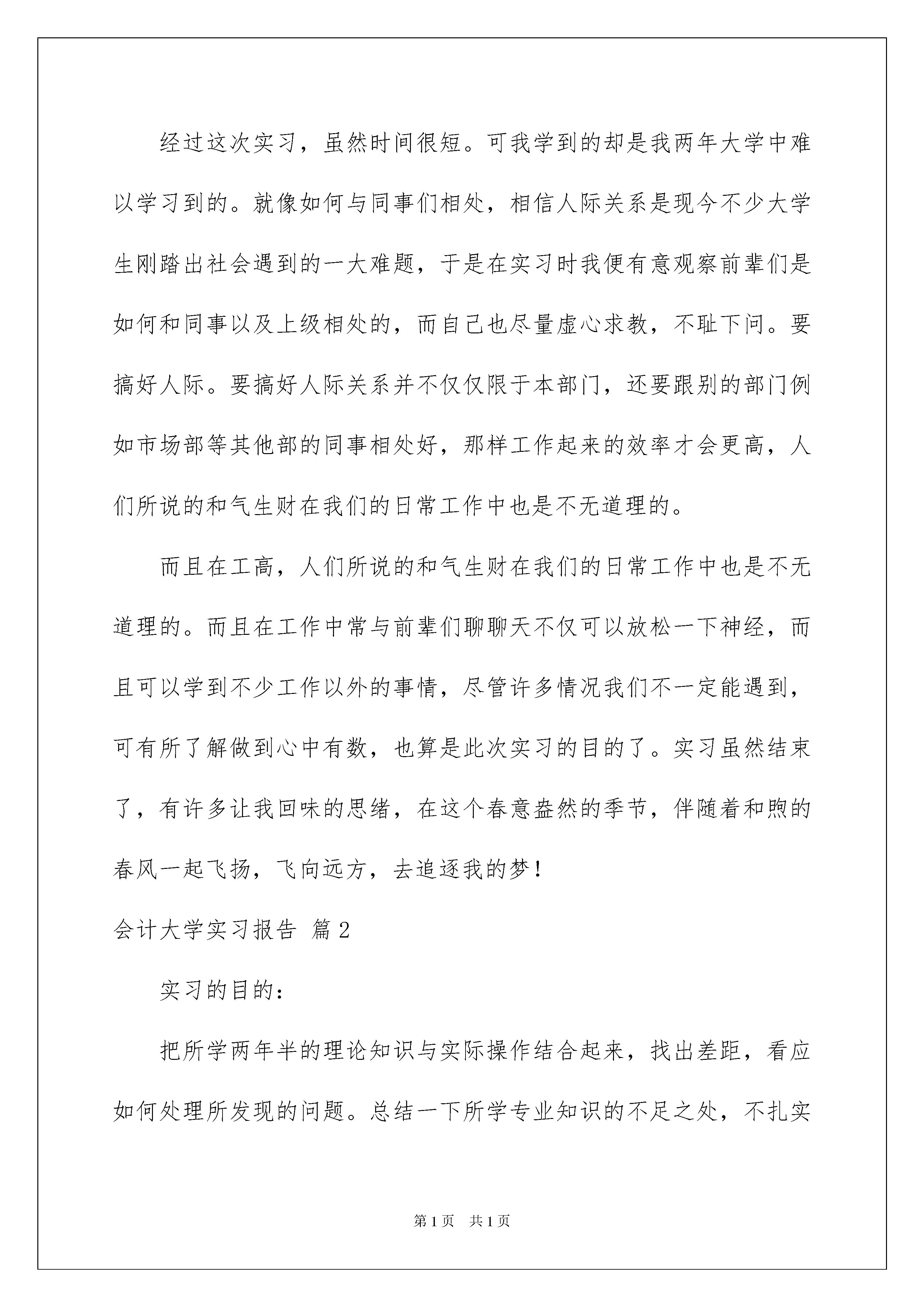 2022有关会计大学实习报告汇编9篇有关会计大学实习报告汇编9篇我们眼下的社会,报告对我们来说并不陌生,报告具有语言陈述性的特点。我们应当如何写报告呢?以下是我精心整理的会计大学实习报告9篇,仅供参考,大家一起来看看吧。会计大学实习报告篇1实习是每一个大学毕业生必须拥有的一段经历,它使我们在实践中了解社会、在实践中巩固知识;实习又是对每一位大学毕业生