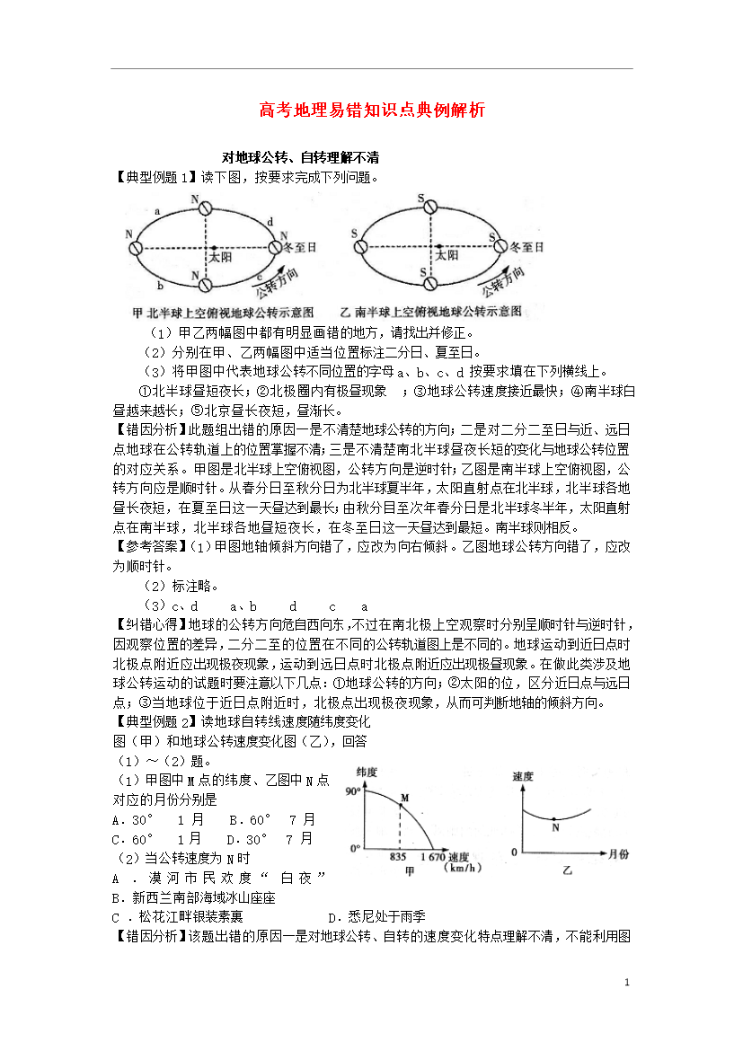 高考地理易错知识点典例解析对地球公转、自转理解不清【典型例题1】读下图,按要求完成下列问题。(1)甲乙两幅图中都有明显画错的地方,请找出并修正。(2)分别在甲、乙两幅图中适当位置标注二分日、夏至日。(3)将甲图中代表地球公转不同位置的字母a、b、c、d按要求填在下列横线上。①北半球昼短夜长;②北极圈内有极昼现象;③地球公转速度接近最快;④南半球白昼越来越长;⑤北京昼长夜短,昼渐长。【错因分析】此题组出错的原因一是不清楚地球公转的方向;二是对二分二至日与近、远日点地球在公转轨道上的位置掌握不清;三是不清楚南