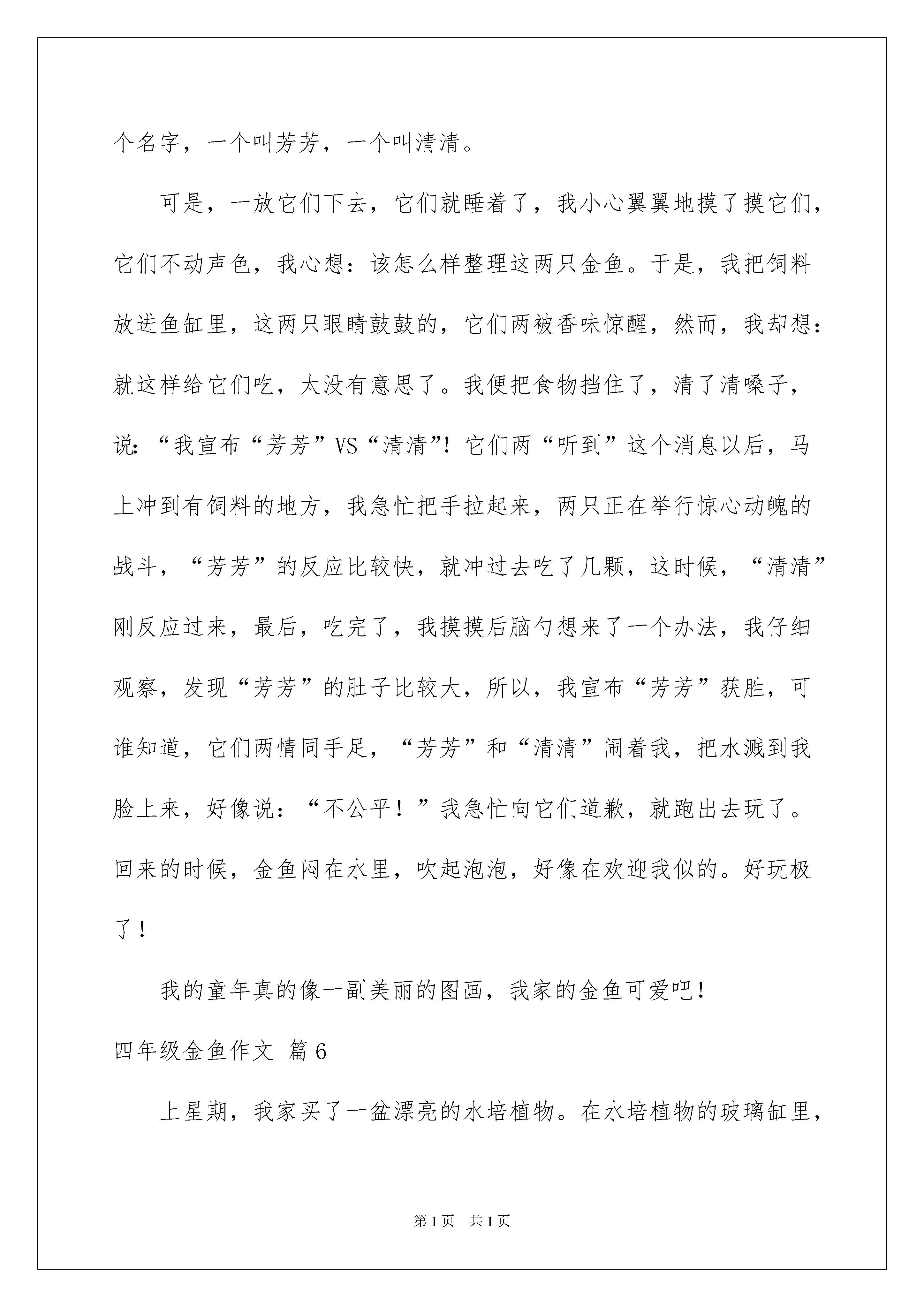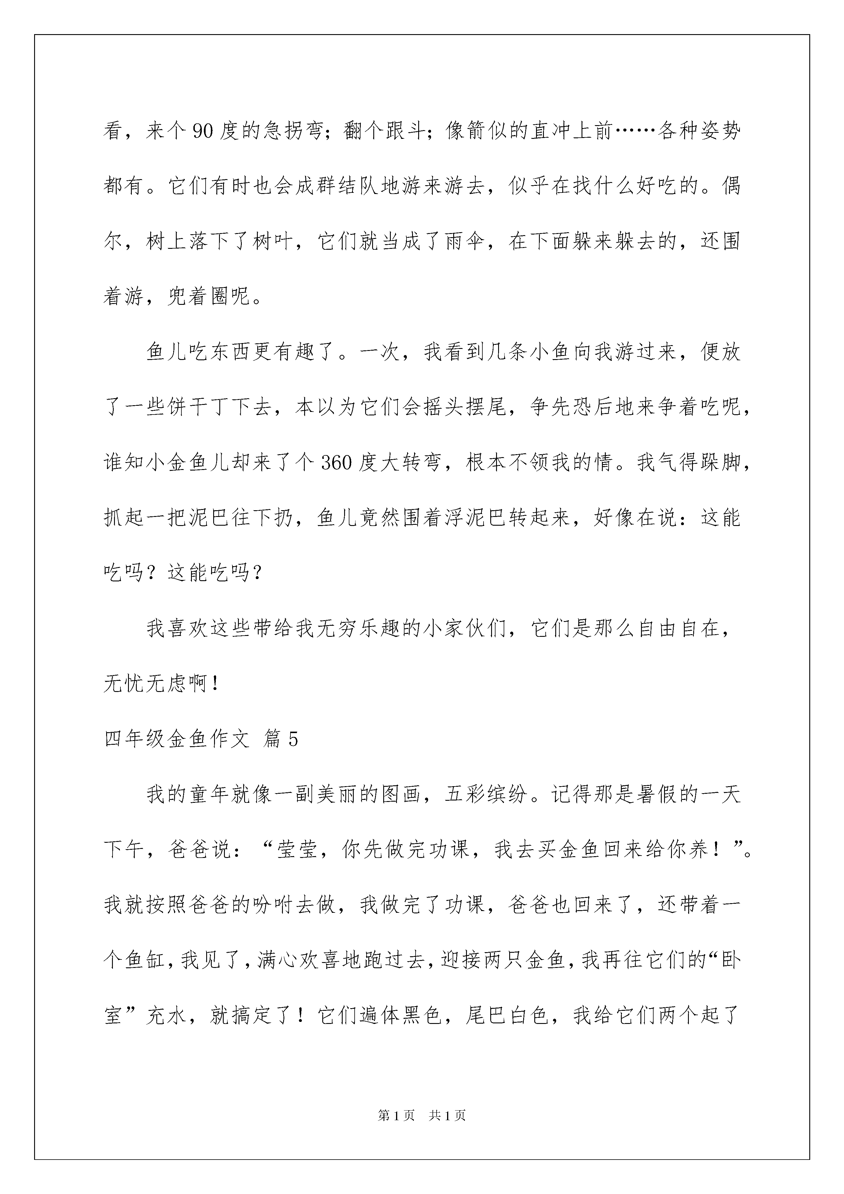2022有关四年级金鱼作文合集六篇有关四年级金鱼作文合集六篇在平平淡淡的学习、工作、生活中大家都写过作文肯定对各类作文都很熟悉吧作文是人们以书面形式表情达意的言语活动。你知道作文怎样写才规范吗?下面是我帮大家整理的四年级金鱼作