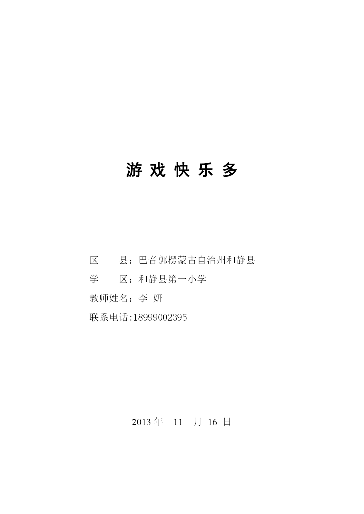 游戏快乐多区县:巴音郭楞蒙古自治州和静县学区:和静县第一小学教师姓名:李妍联系电话:189990023952013年11月16日《游戏快乐多》教学教案设计课时目标:一节课40分钟教学年级:九年义务教育小学二年级设计理念及思路:游戏也可以成为学生学习的另一个课堂,在这个课堂里,学生除了可以学习如何与朋友一起活动,从中懂得谦让、友好相处、照顾他人、也可以学习一个人做游戏的方法,让自己愉悦的独处。总之,学生能借助游戏寻找快乐、体会快乐。本单元旨在通过学生了解单人游戏和无道具游戏来增强学生参与游戏的乐趣,以及提高